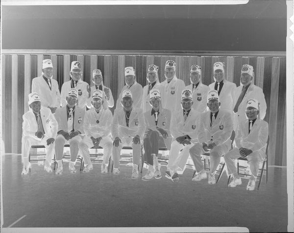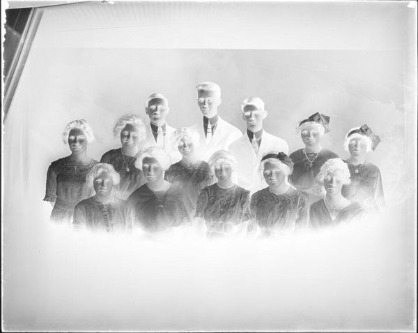 Editor: Here we have an untitled photograph by John Deusing, showing a boy seated with a baseball trophy in front of his team. The image is ghostly because we're seeing it as a negative. What catches your eye about this image? Curator: It speaks to the public role of sports in American culture. The image, likely intended for local circulation, reinforces ideas of teamwork and masculine achievement. Consider how photographic portraits like this, even as negatives, contribute to constructing communal identity. Editor: That’s interesting. So it's not just about the individual, but about belonging? Curator: Precisely! The photo immortalizes these figures in their local context, underscoring the social and cultural importance of team sports. What does it make you think about? Editor: I guess I was focusing on the individual boy and his accomplishment, but you're right. It's also about the team. Thanks! Curator: My pleasure. Analyzing art in its socio-political context can illuminate its meaning.