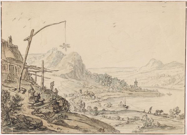 Curator: Up next, we have Herman Saftleven II's "Fantasy Rhine Landscape," created around 1650. What’s your first impression? Editor: It's lovely, subdued. The whole piece feels veiled in a kind of soft, almost melancholic light. It reminds me of late afternoon, watching the sun sink behind a hill and create subtle gradations of light across the scene. Curator: Indeed, there is a tonal quality to the etching, but consider how Saftleven achieves this affect using hatching. He's not only giving us this placid scene but also meticulously building layers. What strikes me most is how printmaking in the 17th century allowed artists to democratize images of their world—creating them with tangible work through manual labor that made them relatively more affordable and available to the public. Editor: Absolutely, printmaking serves as an accessible tool and offers insight into the culture it was produced in. Here you have what seems to be tradesmen and wanderers on this little bluff; you see their goods beside them on the hill overlooking the Rhineland, it seems almost performative to sit up there while their living sits at bay down below. It makes me consider our relation to capital now, and whether we, too, fetishize production, creating separation from labor for the sake of status and optics. Curator: I wonder how many impressions Saftleven would pull from his copper plates? How consistent the final prints? Thinking about his physical endurance, in combination with access to materials. There were no inkjet printers back then! But also, it prompts questions about originality and replication—what is gained and lost when an image moves from being unique to existing in multiple copies? Editor: It is as much about availability and access as it is endurance. Think of the material quality! He worked, physically and psychologically, with such discipline on a drawing to prepare for an image he wouldn't see quite the same once printed, that's kind of wild, to labor toward an image, to prepare, and prepare, and still relinquish that control to an etching press? Curator: It does change everything. As someone encountering the work almost four centuries later, I like thinking about that labor, not just the end result. Editor: Me too. To make beauty, and make beauty accessible!