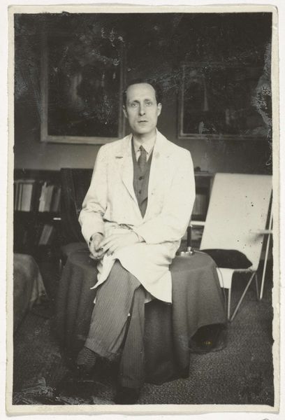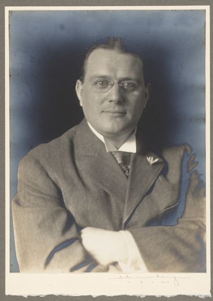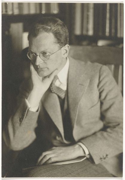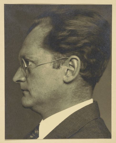 Editor: This is Alfred Stieglitz’s gelatin silver print, “Herbert Seligmann at Lake George," which was created sometime between 1864 and 1946. I find it's stark and feels very direct as a portrait. What strikes you most about its composition and technical elements? Curator: Immediately, I am drawn to the tonal range achieved within the gelatin silver process. Consider how Stieglitz manipulates light and shadow. Notice the almost ethereal glow of the background versus the sharp definition of Seligmann's features. How does that contrast affect your reading? Editor: It makes Seligmann seem very present, but almost detached from his surroundings. He's defined while everything else is light. I guess what I mean is that he seems highlighted but separate. It’s like this intimate portrait that has a detached feeling from it, it makes you think more about who Stieglitz decided to make a portrait of. Curator: Precisely. Stieglitz masterfully employs pictorialism, a style emphasizing artistic effect. But the photograph's modernism also emerges through its inherent realism. The detail within the frame and stark composition contribute greatly to its modernity. Have you considered the use of line and form in creating a focal point, here clearly around the gaze? Editor: Yes, absolutely. Now that you point it out, the shapes made by the shirt collar and glasses guide the eye right to his face, adding to the photo's intensity, right? Also, it being black and white takes away any potential for color distracting you. I initially looked at it as a direct portrait but I understand why we can talk about realism and modernism in it too, beyond it simply being a picture of a person in regular clothing. Curator: Yes, the lines create vectors leading toward the subject. Examining these techniques shows that Stieglitz did more than simply take a picture; he shaped and framed it into his personal and modern vision. Editor: It’s amazing to consider how technical aspects shape a picture’s core message!