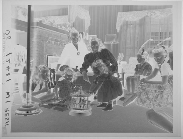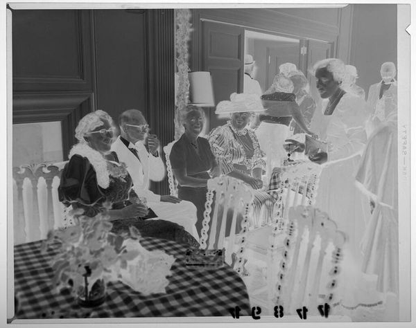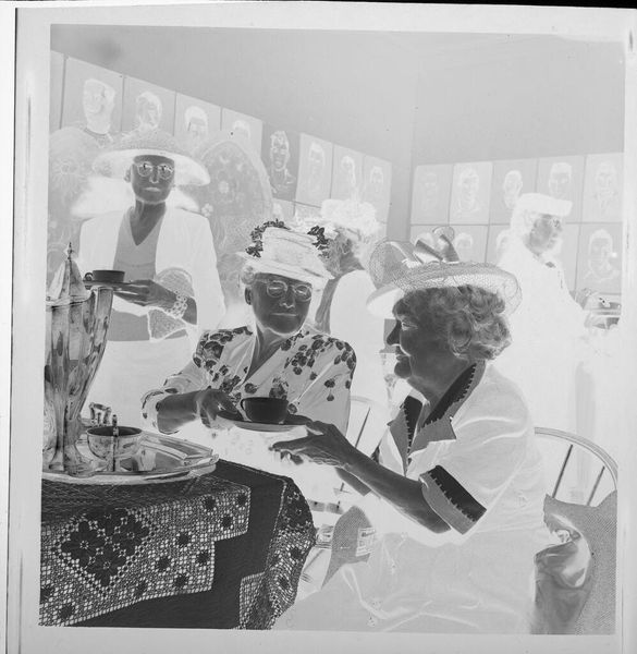 Editor: This is an untitled photograph by Jack Gould, showing three women enjoying tea together. The high contrast gives it an almost dreamlike quality. What’s your read on this piece? Curator: It’s a lovely glimpse into a private world, isn’t it? I'm drawn to the hats, which seem to crown these women with stories of their own. It makes me wonder about the context, their relationships, and whether the photos on the wall are their sons. Editor: Oh, I didn't even notice the portraits on the wall! Curator: Yes, each element whispers secrets. Do you think this photo captures a universal experience? A quiet moment shared by friends? Editor: Absolutely. The simple act of drinking tea becomes something profound. I see connection and intimacy, things we all crave. Curator: Precisely! The photograph captures the essence of shared humanity, doesn't it? Moments like these, frozen in time, become timeless.