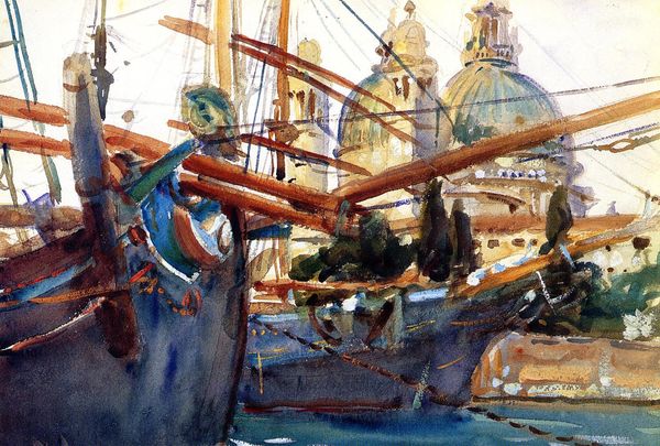 Editor: So, this is John Singer Sargent's "The Piazzetta with Gondolas," made sometime between 1902 and 1904. It's an oil and watercolor painting. There's a definite languid mood to it, and it’s… busy, but serene at the same time. What do you see in this piece? Curator: I see a depiction of Venice steeped in its historical context as a hub of trade and a playground for the wealthy elite. Sargent's loose brushstrokes, while beautiful, also hint at the ephemerality of this particular moment in Venice's history. This piece, viewed through the lens of, say, postcolonial theory, might make us ask: Who truly benefits from this idyllic scene, and who is excluded? Editor: Excluded? It seems like there are people everywhere. Curator: Indeed, but who are those people? Are they the gondoliers, facilitating the leisure of the upper classes? Or the tourists who perpetuate this vision of Venice? What stories aren’t being told in this painting? Are we seeing the experiences of women? Or laborers toiling behind the scenes to maintain this carefully constructed image? Think about how this "postcard view" has become a commodity, overshadowing the lived realities of many Venetians. Editor: I hadn’t really considered that. I was caught up in the beautiful colors. Curator: Absolutely, the Impressionistic style draws you in! But it's important to remember that art often reinforces power structures, even unintentionally. By questioning what is *not* shown, we can engage with art in a more meaningful and critically conscious way. Does this lens change how you understand Sargent’s intentions? Editor: It definitely does. It’s a little unsettling but also makes the painting feel more relevant, less like just a pretty picture. I'll never see Venice, or any landscape painting, the same way again. Curator: Precisely! And that's the power of looking at art with a critical eye. It encourages us to think beyond the surface and engage with the complex social realities that art reflects, reinforces, or, ideally, challenges.