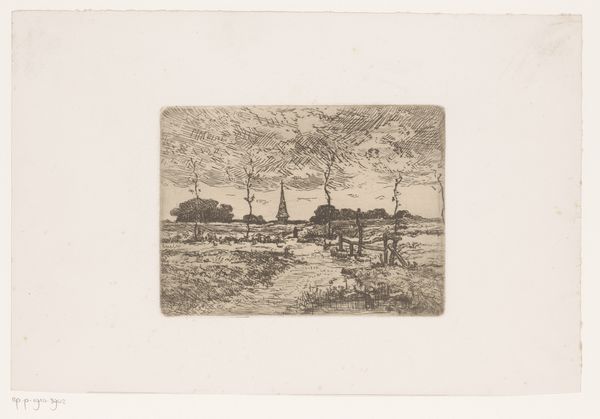 This etching, made by Louis Adolphe Jacobs, captures a landscape with a path between two farmhouses, and a mill in the background, through a swarm of tiny marks. The whole thing feels like a whispered memory. Up close, the surface reveals a network of fine lines, hatching and cross-hatching, which together conjure the texture of the grass and foliage. Look at the way Jacobs renders the sky, it’s not a solid block, but a field of these precise marks that give the illusion of light and atmosphere. It’s about a place, but also, very much, about a process. The small, repetitive marks remind me of the dense, all-over compositions of Agnes Martin, or even some of those pointillist painters. Like them, Jacobs embraces the quiet energy of incremental mark making, building a whole world out of simple, repeated gestures. Art is just people talking to each other, across time.
