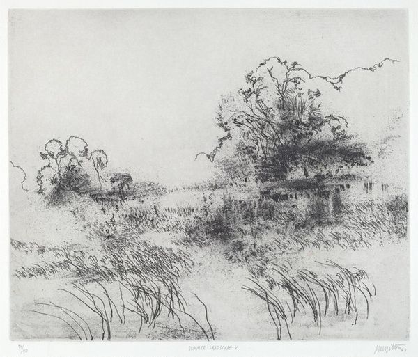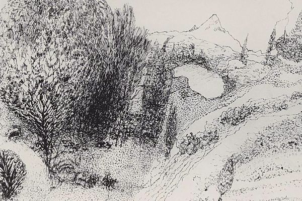 Editor: Here we have Peter Takal's "Trees and Fields," a drawing created in 1957 using ink and pencil. It's quite sparse, almost like a fleeting memory of a landscape. What strikes me most are the dashed lines floating above the fields; they lend the image a real sense of movement. How do you interpret this work? Curator: Well, given Takal's background, I see this drawing as participating in a broader mid-century conversation about humanity's relationship to nature, particularly within the context of post-war reconstruction and increasing industrialization. The "fleeting memory" aspect you mentioned feels quite deliberate, potentially highlighting a nostalgic yearning for a simpler, less disrupted landscape. Do you think those dashed lines could also represent a kind of boundary or even disruption, superimposed upon the natural scene? Editor: That's an interesting point. I was focused on the movement, but a boundary makes sense too. Could this relate to post-war land use policies at all? Curator: Precisely. Art historians examine the period's anxieties regarding urban sprawl, agricultural reform and the shifting role of rural communities, things that are tied to social progress narratives, and these are things that absolutely influenced artists. So this is perhaps not just a picture of a landscape, but a quiet commentary on its changing status. Does knowing this change your view of the image? Editor: It does, quite significantly! I see it now as much more intentional, and definitely more poignant. Thanks, that gives me so much to think about regarding the social context. Curator: Absolutely! I learned to look closely at lines differently through our conversation. I appreciate your observation regarding its sense of movement; something I didn't consider initially.