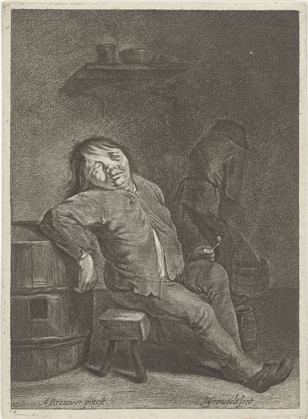 Curator: We're looking at "Luiheid," an engraving by Jean de Weert, created sometime between 1636 and 1700. It presents a figure of indolence personified. Editor: My immediate impression is one of exhaustion and perhaps subtle commentary on the state of rest and work in Dutch society. The way he's slumped—it’s a pose of utter surrender to sleep. Curator: The piece is striking for its era, focusing on the everyday. De Weert captures what one might call a 'genre scene.' It deviates from depicting prominent members of society and grand historical narratives, to reveal scenes from normal life. How do you think this impacts the viewer? Editor: Significantly. As a print, "Luiheid" would have been relatively accessible. Consider the material conditions of the time. The affordability of prints allowed for a wider distribution of ideas about labor and leisure among the merchant classes. The details in the subject's attire - perhaps a craftsman? It provokes thought about the relationship between work, exhaustion and status within this societal tier. Curator: True. Beyond the mere image of someone asleep, consider the allegorical weight of 'sloth'. This symbol extends beyond the individual, reflecting on a wider societal understanding. The work contrasts with images of civic responsibility and hard work, as upheld during the Golden Age. Does this imply that de Weert sees this scene as problematic? Editor: Possibly, although, let's not overstate the negativity. The material depiction - the lines making up the soft pillow against the wooden bench - brings a degree of human empathy to the 'sin' of sloth. The engraving's sharp contrasts invite introspection. It pushes viewers to reconcile labor demands and our need for reprieve, particularly through mass consumption of engravings like this. Curator: I agree. And maybe here lies the crux. The simple image of 'sloth', as immortalized by de Weert, reflects that ongoing cultural and social negotiation between duty, pleasure and their complicated interplay. Editor: Precisely. By considering the materiality and social context, the layers begin to peel back revealing something richer than a mere depiction of a sleeping person.