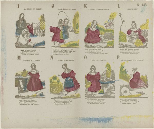 Curator: Here we have "Allerlei bezigheden" or "Various Occupations" by Willem Carl Wansleven, dating from 1806 to 1858. It's a drawing made with pen on paper. Editor: Oh, what a charming page! It feels like stumbling upon a sheet of lovely, gentle vignettes—each one a little story, each with a touch of old-world elegance and contained wistfulness. Curator: Indeed, the drawing comprises nine separate scenes, each portraying figures engaged in different activities – socializing, reading, riding. The method of reproduction is interesting, pointing to broader issues of print culture and how images were consumed at the time. These miniature scenes, neatly arranged, would have circulated as part of a print series, maybe even hand-colored later on. Editor: I'm drawn to the way the penwork creates such delicate textures, almost like faded tapestry. There’s a sense of looking into the past, the lines hinting at half-remembered tales and forgotten flirtations beneath shaded trees, or convivial meetings over ale. Each figure seems both composed and strangely vulnerable. Curator: The themes Wansleven touches upon, like courtship, leisure, or reading, are pretty characteristic of genre painting from this period. But he gives the subject matter this distinctive treatment using accessible means: inexpensive materials rendered into a replicable design. It gives it an unusual place between craft and art. Editor: Absolutely. And the tiny rhymes underneath! “Hier heb ik mijn lief – och Fierrike, zie je niet? – Ik zou’d wel zo’n poes – Dat wie je liet!" ("Here I have my love – oh Fierikke, don't you see? – I’d be such a darling – if you’d let me!"). It really enhances this tender sense, these are scenes plucked straight from a daydream. There’s a real affection there for simple human connection. Curator: By looking at this drawing, we can examine print production. Wansleven democratized both artmaking and consumption, taking them beyond just oil paints and elite patrons. Editor: To me it all boils down to a celebration of the quiet moments, beautifully captured. It invites the imagination to wander and to invent those silent stories hovering around the scene, around that couple, around that secret word under the trees... Curator: I hadn't thought about it quite like that, but now I think I will carry that away as well! Editor: Beautiful, and to our listeners: go ahead and have "Allerlei bezigheden," each special in its moment!