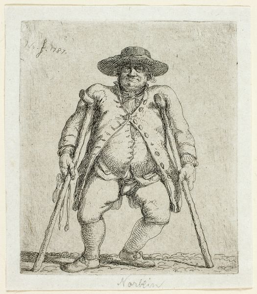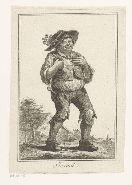 Curator: This print, "Man with a Walking Stick in a Landscape," was created by Robert Brichet in 1784 using engraving techniques. Editor: The subject of this portrait seems confident. What I notice most are his somewhat elaborate garments, juxtaposed against the natural simplicity of the landscape. What do you see in this piece, especially concerning its social context? Curator: Precisely! It's critical to examine the social dynamics at play. In late 18th-century Europe, marked by emerging class tensions, portraiture wasn't merely about representation. The man’s attire, coupled with his confident posture, speaks to a deliberate construction of identity. Consider also the burgeoning Enlightenment ideals circulating at the time—do you think this image might subtly comment on, or even critique, aristocratic conventions? Editor: That's interesting. It didn't immediately strike me as a critique, but more like a straightforward depiction of a man of the time. How might his social class and its politics be subtly revealed in what he's wearing? Curator: His hat, for instance, isn't exactly what a member of nobility might choose, and the somewhat nonchalant way he holds his walking stick doesn’t signal the hyper-formality expected of the aristocracy at the time. Now, consider what “landscape” might have represented—was it simply background, or a coded assertion of land ownership, privilege and even masculine entitlement? Editor: I see what you mean. I had just considered it a backdrop. I will never see another landscape the same way again. Curator: Exactly. It is not only the subject in the landscape, but also their social status within a changing society. We've looked closely at a piece produced during a turbulent epoch, in which revolution brews as ordinary life persists.