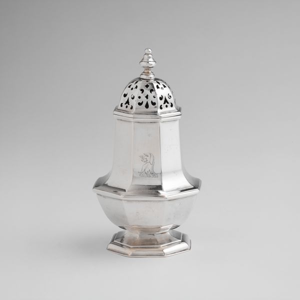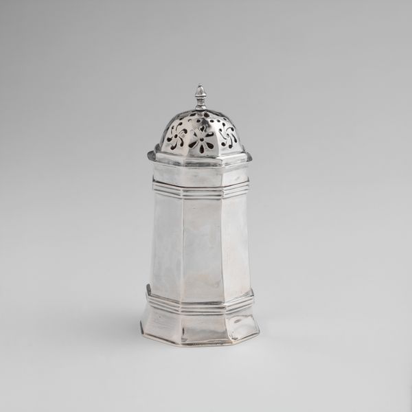 Editor: This is "Caster," made between 1760 and 1775 by John Gardiner. It’s silver, so quite striking in its reflective qualities. It's categorized as decorative art, and looking at the elaborate design on the top part of the vessel makes me curious about the social and historical context it comes from. What can you tell me about it? Curator: Well, the “Caster” here gives us a direct link to the 18th century and the rituals around tea and dining, doesn’t it? The availability of sugar, for example, signified status and wealth. Do you notice the piercings? Editor: Yes, the upper part has a really intricate, symmetrical pattern of holes. Curator: Precisely! This regulated how sugar, likely a luxury good at the time, would be dispensed. Consider who could afford such pieces, and what message displaying something like this might send. Think of the social hierarchies it reflects. Editor: It's amazing to think of something so beautiful being tied to social standing. So, possessing decorative art like this Caster almost functions as a subtle display of social and economic power. Did the intricate pattern add to that effect? Curator: Absolutely. Labor was also a commodity and its visibility in the detail work further advertised affluence. It reflects consumer culture and the artistry associated with this kind of presentation. These objects shaped societal rituals as much as they were shaped *by* them. Editor: That's fascinating; I'll never look at a sugar caster the same way again. Thank you! Curator: My pleasure. Now you're seeing art history in a completely new light.