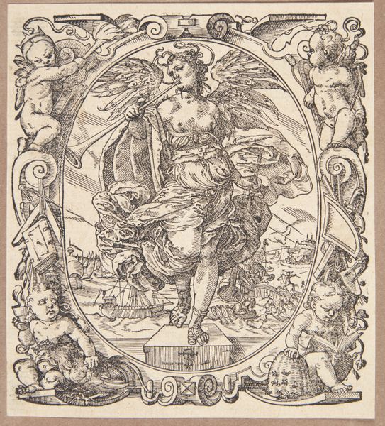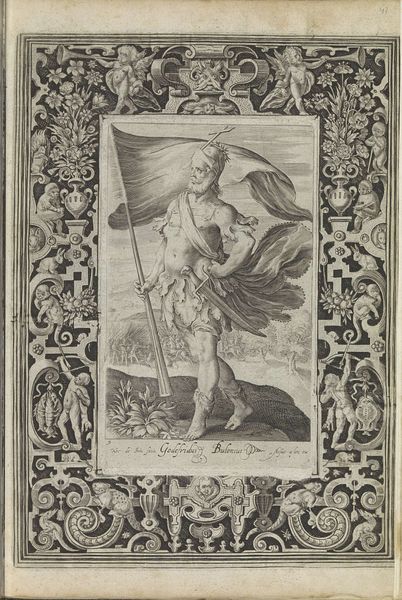 Editor: So, this is "Alexander de Grote" by Nicolaes de Bruyn, created sometime between 1582 and 1635. It’s a print, an engraving on metal. The ornate border feels a bit like a stage, framing Alexander on horseback. What strikes you most about the image? Curator: I'm immediately drawn to the density of symbolic imagery here. The central figure, of course, is Alexander the Great, a historical figure loaded with meaning. But it's the visual language *around* him that speaks volumes about how the artist, and perhaps the culture of the time, viewed Alexander. Notice the frame – a dense collection of flora, fauna, skulls...what might these disparate images evoke, do you think? Editor: The skulls seem like an obvious memento mori, a reminder of mortality even in the midst of glory. The animals maybe suggest different aspects of his character or his dominion? Curator: Precisely! Skulls whisper of the inevitable end, the fate that awaits even the mightiest conqueror. Alexander, a symbol of triumph and earthly power, is thus juxtaposed with images of vulnerability and death. The animals can certainly symbolize his reach, his ambition extending to the natural world. And think about *why* the artist chose these *particular* animals. What qualities do they possess? Editor: I see an owl, so wisdom, and maybe the fox implies cunning? Curator: Yes! Each creature adds another layer to our understanding of Alexander – or at least, the *desired* understanding crafted by the artist. This isn't just a portrait; it's an icon, meant to instill particular emotions and understandings. This careful placement and selection builds cultural memory. Editor: It’s amazing how much meaning can be packed into what I initially just saw as a decorative border. Curator: Indeed. By recognizing and understanding these symbolic elements, we can unravel not only the artist's intent, but also the values and beliefs of the culture that produced this powerful image. Editor: It completely reframes how I see the piece, like the whole image is speaking a hidden language.