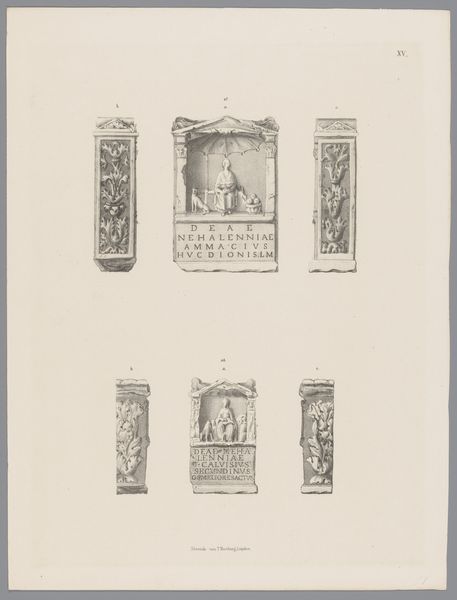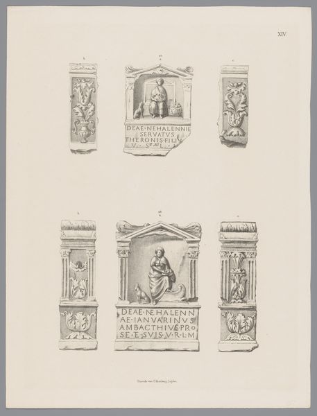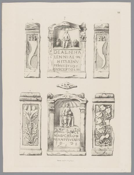 Curator: These are photographic reproductions of prints and a drawing showcasing architectural elements. The sheet dates from roughly 1875 to 1900 and, intriguingly, the artist remains anonymous. Editor: Immediately, the precision and repetition strike me. It’s like a neoclassical pattern book, meticulously documenting every scroll and capital. The columns, especially, they possess a distinct weight of tradition. Curator: Absolutely. Consider the context. Academic art of this era focused intensely on the faithful reproduction and study of classical forms. Architecture was viewed as a pillar of civic virtue, these drawings offered examples. Editor: I see in these architectural flourishes so much more than just decoration. They embody the Roman ideal: authority, order, permanence. A building isn't just shelter. The cornucopia motifs promise bounty; each carefully placed volute speaks to the legacy of a vast empire. Curator: Precisely! This kind of imagery reinforced societal hierarchies. Displaying such meticulous rendering of classical elements demonstrated not only artistic skill, but also one’s connection to that inherited authority. They offered a very literal blueprint for constructing—and perpetuating—power. Editor: I'm interested in the cross-cultural application and manipulation of classic forms through the centuries. We build our identity, one visual reference on another. The dragon intertwined with the acanthus leaves seems very symbolic in that light. Curator: A compelling point! It prompts consideration of evolving values and cultural blending reflected in the enduring symbols and their adaptations. The museum acquiring these reflects their enduring utility and interpretation. Editor: Studying the evolution and appropriation of these archetypes gives so much to those of us looking into inherited narratives. Curator: For me it highlights how power manifests visibly over time, and how artists and institutions are always implicated in those processes.