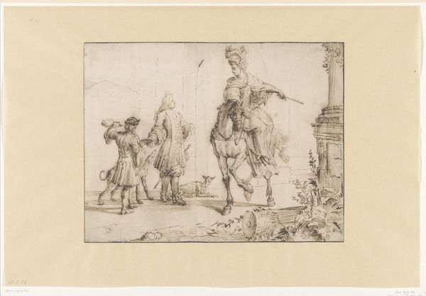 Curator: We're looking at Giovanni Battista Romero’s "Aeneas en Creüsa," created around 1804 using pencil on paper. It captures a dramatic moment from Virgil's Aeneid. Editor: It's stark. Almost feels like a freeze-frame from a play, this incredibly clean draftsmanship but also so cool, in both senses, given the chaos depicted in the background. Curator: The neoclassical style certainly lends itself to that feeling. Romero is tapping into the ideals of heroism and duty, very much in vogue at the time amidst sociopolitical changes, though also exploring male anxiety through Aeneas's figure. Think of the performance of masculinity amidst trauma and displacement here. Editor: And trauma inflicted, of course. Creusa, his wife, is barely being rescued. I see her reaching out. Are we supposed to admire this stoicism, the heroic ideal even as his wife is clearly lost, or should we feel anger that his ambitions overshadow everything, even the family left behind? Curator: Absolutely. Look at the careful rendering of Aeneas’s muscular physique versus the obscured face and the less defined forms of Creusa and their child. Power, control and active agency are explicitly male and embodied, whilst the feminine and youthful are rendered passive or spectral. The history of representation echoes those lived power dynamics. Editor: I find that choice very telling, how it echoes larger cultural attitudes about whose stories matter. And it makes me think about the women artists who were simultaneously pushing back against those restrictions, finding ways to subvert these patriarchal narratives. What role did displays of Neoclassicism play within the cultural power structures of its time? Curator: Precisely. Neoclassicism offered a vocabulary for legitimizing power, casting contemporary figures into these idealised classical molds. Romero engages and possibly critiques this as we witness Aeneas’ back turned against his loved one. Editor: Seeing it that way makes me consider what other, marginalized voices would say about this supposedly defining moment in the establishment of Rome. What does it cost? What did those not granted visibility in this narrative forfeit? Curator: This sketch definitely offers fodder for dissecting narratives and questioning historical silences. Editor: A frozen snapshot of so many tangled complexities... I’m left wanting to know more about those voices on the margins of Aeneas' escape from Troy.
