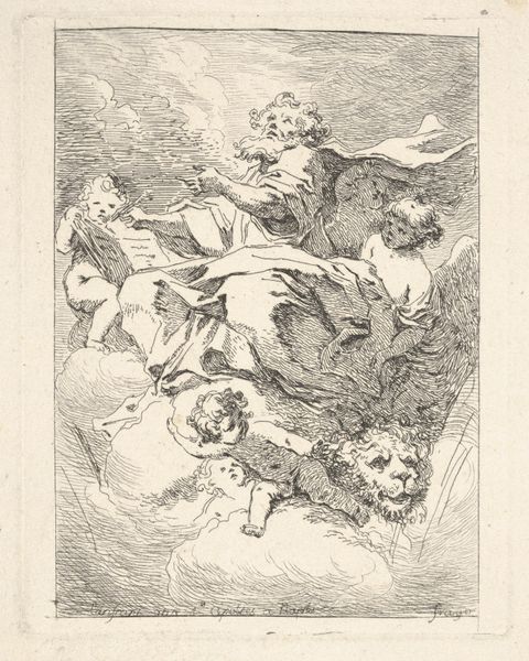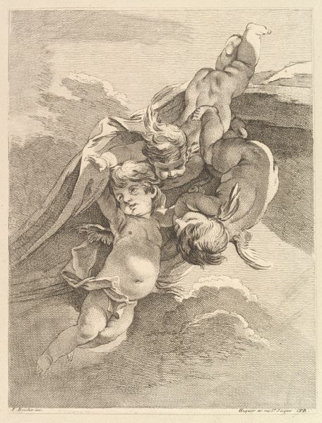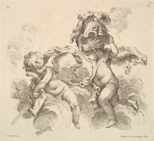 Louis Félix de La Rue created this print of three cupids and an eagle in France, sometime in the mid-18th century. It exemplifies the lighthearted, decorative style that was in vogue during the reign of Louis XV. This aesthetic was promoted by the Royal Academy of Painting and Sculpture, which dictated artistic taste at the time. Prints like these helped disseminate fashionable styles from the capital to the provinces and beyond. The imagery draws on classical mythology, with cupids referencing love and desire, and the eagle symbolizing power. However, here, the cupids are engaged in playful, rather undignified antics. Are we looking at a comment on the social structures of its own time? Is it self-consciously conservative or progressive? Does it critique the institutions of art? To fully understand the nuances of this print, we can look to period publications, such as art criticism and fashion magazines. These sources offer insights into the cultural values and artistic debates of the time, allowing us to understand this artwork in its original social context.