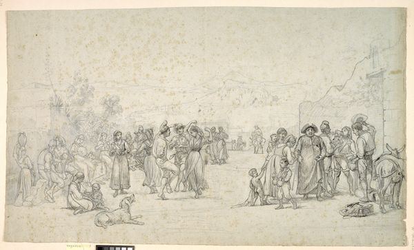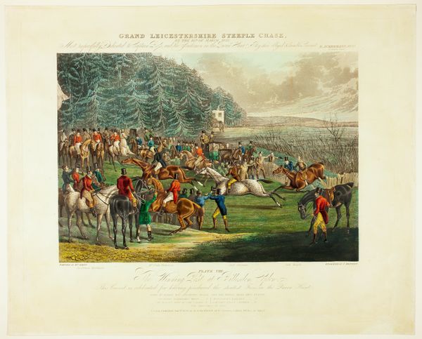 Editor: This is "The High-mettled Racer," a print made in 1789 by Thomas Rowlandson, using etching and watercolor. It captures a horse race, filled with figures, coaches, and lots of frenetic energy. It makes me think about the culture of betting and the upper classes at that time. What stands out to you about this work? Curator: As a materialist, I immediately notice the labor embedded in this seemingly frivolous scene. Etching and watercolor, while perhaps considered "lesser" media than oil painting at the time, allowed for mass production and wider consumption. Who was buying these prints, and how did their social standing relate to the culture depicted? The frantic energy you mention can be interpreted through this lens: It isn’t simply a spontaneous gathering but an economically charged spectacle, right? Editor: That's fascinating! I hadn't considered the socioeconomic aspect of printmaking itself. So, you are suggesting we think about this artwork not just as a snapshot of leisure, but also as a product deeply intertwined with production and consumption. Curator: Exactly! Look at the details – the caricatured faces, the implied wealth in the carriages – it all points to a specific audience and the artist's engagement with them. How does Rowlandson present that relationship between the privileged class enjoying the sport, and his own production for them? Editor: It’s almost like he's both satirizing and catering to them at the same time. The etching makes it accessible but the watercolour adds value…making it a commodity for these very people. Curator: Precisely. By understanding the means of production and the target audience, we gain a far richer understanding of the social and economic underpinnings of this seemingly simple sporting scene. It goes beyond mere aesthetics. Editor: I'm going to be thinking about prints very differently from now on! This has really shifted my perspective on the work.