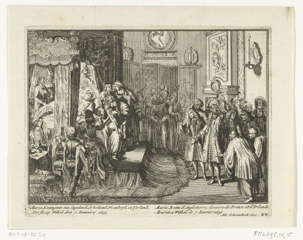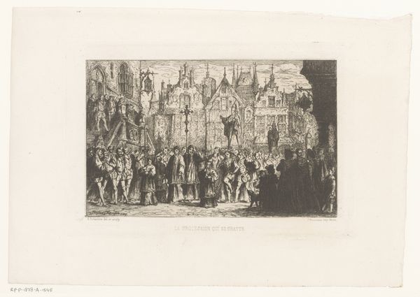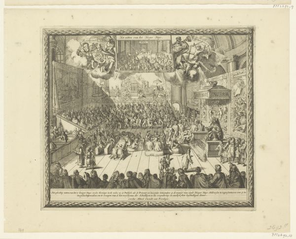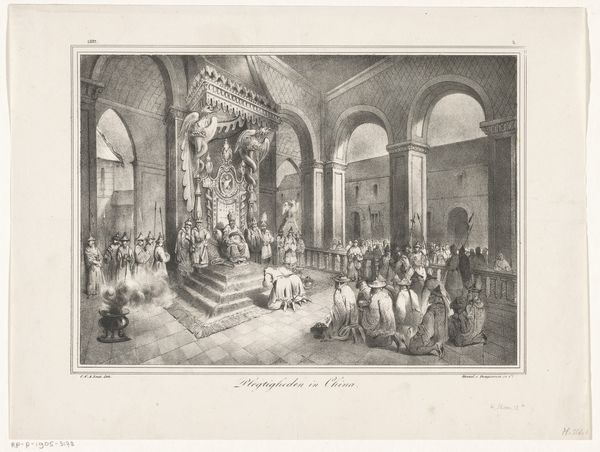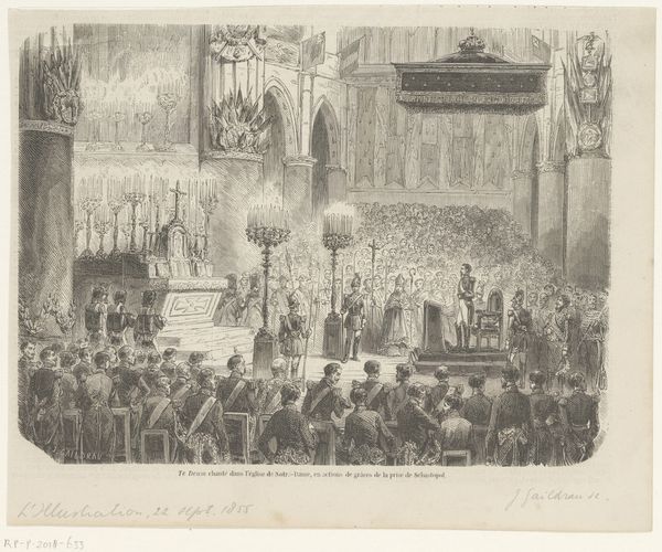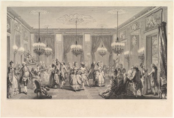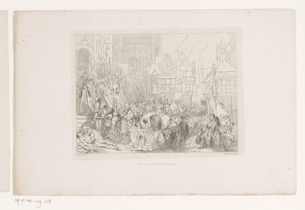 Editor: Here we have Jules Worms’s 1855 ink drawing, “Hôtel de ville bij het bal aangericht ter ere van koningin Victoria, 1855,” which depicts the ball at the Hôtel de Ville in honor of Queen Victoria. It has an incredible sense of grandeur, capturing the spectacle of the event. How do you interpret this work? Curator: For me, the most striking element is the visual encoding of power and cultural exchange through symbolism. Consider the grand staircase. It isn’t merely an architectural element, it's a stage upon which national identities and social hierarchies are performed. Each figure, each ornament, whispers something about the complex dance between England and France during Victoria's visit. Editor: That’s fascinating. I hadn’t thought of the staircase itself as a symbolic space. The figures on it almost seem like they're enacting a play. Curator: Exactly. Now, think about what the artist chooses to show, and more importantly, what's left out. What emotions are conjured? What kind of memory is the artist creating? How does it connect with or deviate from existing visual representations of power, royalty, and international relations during the 19th century? This all impacts the work’s symbolic value. Editor: So, beyond just a historical record, it's an interpretation filtered through Worms's own lens and the symbolic language of the time. The flamboyance is intended. Curator: Precisely. And recognizing that symbolism allows us to engage more deeply with history. It’s about the echoes of the past reverberating into the present. Editor: I never thought about how much encoded information can be found even in just a pen sketch, especially in terms of symbols. Thanks for shining a light on that! Curator: Indeed. The enduring strength of an image resides in its symbolism; It’s cultural memory captured in lines and shapes.