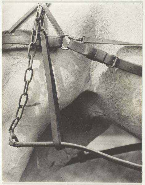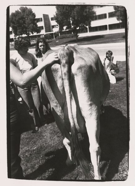 Curator: Bill Dane's photograph, "Untitled (Berkeley)," presents us with an intimate, unadorned study of a donkey, captured in black and white. Editor: Its distressed state is immediately apparent. Is it braying, or simply caught in a moment of discomfort within this stark, almost claustrophobic setting? Curator: The composition relies heavily on the interplay of light and shadow, accentuating the texture of the animal's coat and the roughhewn wood of what appears to be a stall. Editor: And the political connotations? The Democratic Party's mascot trapped in what looks like a dilapidated space—one wonders what Dane intended to convey about the state of American politics. Curator: Perhaps Dane was less concerned with overt political commentary and more interested in the pure form—the lines, the tonal range, and the inherent structure of the image itself. Editor: Regardless, it opens up compelling questions about representation, identity, and power. It encourages the viewer to consider the animal's symbolic weight. Curator: Indeed, an image that provokes contemplation on multiple levels. Editor: A potent reminder of the many layers embedded within a seemingly simple photograph.