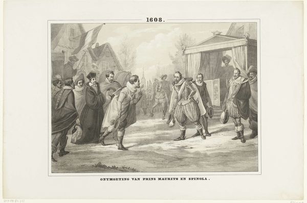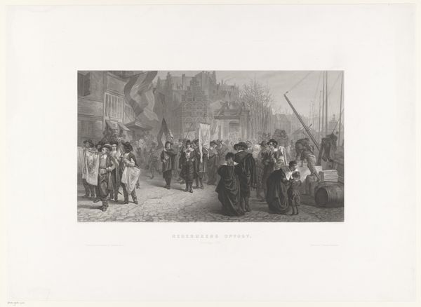 Editor: Here we have Johann Wilhelm Kaiser’s "Witte van Haemstede te Haarlem," an engraving made sometime between 1840 and 1884, now residing in the Rijksmuseum. I am immediately struck by how this piece seems to want to capture a significant historical event. What historical contexts inform this representation of power? Curator: This engraving is deeply embedded in a 19th-century fascination with medieval history, specifically a romanticized view. How does the depiction of Witte van Haemstede, likely a local hero, serve as a reflection of contemporary national identity and its construction? Look at the other figures - what classes do they belong to and what can be surmised about the engraver? Editor: I see that there are more 'common folk' at the rear with the more elite and clerical ones close by... It also makes me think about the visual language being employed here - does the 'realism' serve to legitimize the narrative? Curator: Exactly. Realism, in this context, becomes a tool for constructing a particular version of history. How does the artist’s choice of engraving—a medium often used for mass dissemination—influence the accessibility and interpretation of this historical narrative for a broader audience? How do elements like his stance and clothing contribute to the overall message? Editor: It seems the intent is to rally people behind him but also emphasize the moment and show this legendary leader in all his armor glory... something like propaganda even? Curator: Precisely. Consider then the relationship between art, power, and the creation of national heroes, how did it influence not only historical narratives but also shape social and political realities? Editor: Understanding this piece through the lens of social and political contexts truly brings its intended power to the forefront. Thank you. Curator: My pleasure, examining art as a product and a driver of historical narratives offers invaluable perspectives.