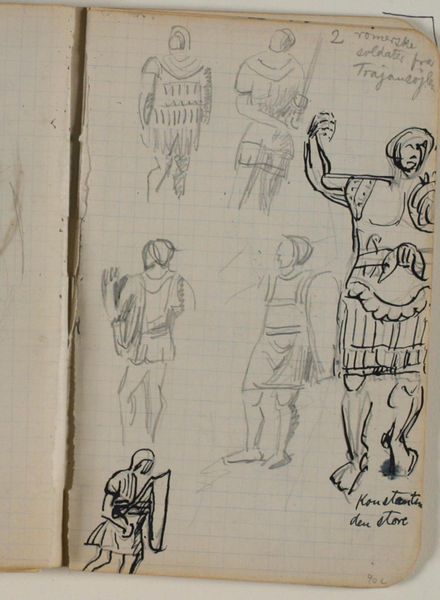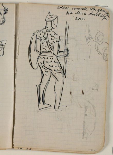 This is Niels Larsen Stevns' "Skitse af romersk soldat," or "Sketch of a Roman Soldier," probably made with ink on paper. It’s like seeing the ghost of an idea, hovering on the page. What strikes me is how Stevns uses line—look at the soldier’s drapery, all these quick flicks and curves that suggest form without really defining it. It’s the art of suggestion, isn’t it? The sword hanging at his side is just a few dark strokes, but your mind fills in the rest. Notice how the lines thicken and thin, giving weight and shadow with incredible economy. Think about the grid underneath—it’s like the artist is acknowledging the structure, the support, even as he lets his imagination roam free. This work reminds me of other sketches of figures I've seen by Picasso. Ultimately, this sketch is less about historical accuracy and more about the act of seeing, the joy of making marks.
