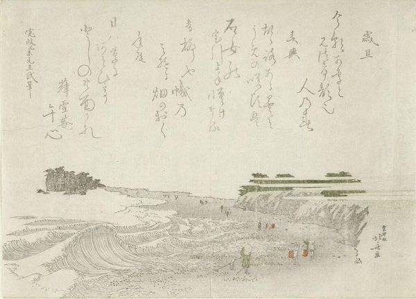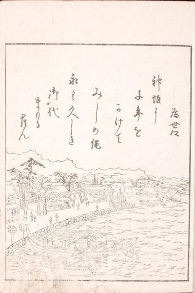 Editor: Hokusai's "Night Rain in the Yoshiwara," from the series "Eight Fashionable Views of Edo," is a striking woodblock print. The monochromatic palette creates a somber, almost secretive mood. What compositional elements stand out to you? Curator: Notice the organization of space, Editor. Hokusai employs a distinct layering: the distant rooftops, the bustling street, and the foreground water. The rhythmic repetition of forms—roofs, umbrellas—creates a visual cadence. What might that signify? Editor: Perhaps the relentless, everyday nature of life in Yoshiwara, even in inclement weather? Curator: Precisely. The artist's formal arrangement underscores the enduring character of this place. The linear perspective, while present, is flattened, prioritizing surface design over spatial illusion. It draws our attention to the print's inherent two-dimensionality. Editor: I see it now! The composition reinforces the subject. Thanks for pointing out those aspects.