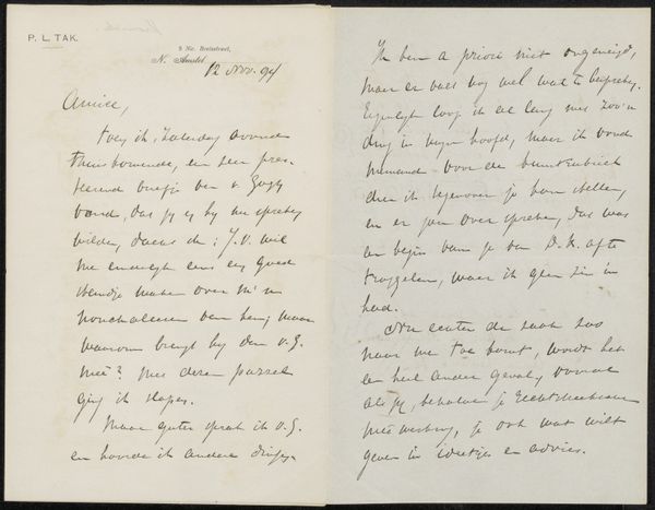 Curator: This work, entitled "Brief aan Jan Veth," which translates to "Letter to Jan Veth," is believed to be from 1906. It’s by Alphons Diepenbrock, created with pen and ink on paper. What are your initial thoughts? Editor: My first thought? Intimate. It’s as if we’ve stumbled upon a deeply personal exchange, a peek into Diepenbrock's private world. The looping script dances across the page—inviting, yet slightly guarded. Curator: Exactly. Diepenbrock wasn’t just composing a note; he was crafting a visual object. Notice the deliberate variations in line weight and the almost calligraphic flourishes. This piece goes beyond mere correspondence. Editor: Agreed. The very act of hand-lettering—so removed from the mechanical printing press—imbues it with a handcrafted quality. It brings the labor to the forefront, making you think about the physical act of its creation, each stroke, each carefully chosen word. Who was Jan Veth and what relationship existed? The content of the letter surely adds layers too. Curator: Jan Veth was an important artist, critic, and intellectual figure in the Netherlands. You can tell by Diepenbrock’s attention to composition, and overall artistic sensibility in a correspondence is testament to their intellectual camaraderie and Diepenbrock’s awareness that what he inscribed, even if fleeting, has some merit. This personal “letter” is in itself elevated and meant to reach us—isn’t that a funny concept? Editor: Absolutely, a playful exchange, meant to spark conversation as all letters once did, before they turned into email. It's remarkable how such a simple medium – pen on paper – can become so compelling when infused with deliberate intention. I see these gestures and can help but consider the economic exchange of the materials itself, its worth today in comparison. The production of writing itself is being valued, in effect. Curator: Yes! Diepenbrock understood how materials inform content. Through a personal, careful script that demands closer viewing, his choice to write as he did says much about who he was relating to. Editor: Indeed. Seeing it as both documentation of social contact and reflection of artistic principles makes one reconsider the letter altogether. Curator: Looking closely and carefully has opened this piece of history to wider perspective, what joy to learn about Jan Veth. Editor: I can also now go and look at materials in different ways—from personal object to economic material.