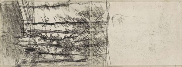 Editor: This graphite drawing, "Figure on a Forest Path and a Figure in a Hilly Landscape," was created by Anton Mauve sometime between 1848 and 1888. I'm struck by its quietness. It feels like a fleeting glimpse into someone's memory of a walk. What do you see in this piece? Curator: I see a potent duality at play. The figures are dwarfed by the immensity of nature, almost consumed by the symbolic weight of the landscape. Look at how Mauve uses the trees on the left like cathedral pillars, framing the solitary figure in the distance, evoking a sense of reverence and perhaps insignificance. Editor: That's interesting. I was focused on the simplicity, but the tree pillars do feel like framing now that you point that out. Is the figure on the right doing something similar? Curator: Precisely. Notice the density of the shading and dramatic sky compressing and obscuring the small figure. Consider how the visual compression and obfuscation creates a mood, that is less about simple representation of nature, and more about invoking feelings of existential pondering in a romantic framework, recalling, perhaps, ideas from writers of the period such as Thoreau. Are we really present or merely memories in our mind's eye? Editor: Wow, I hadn't thought of that connection. It really transforms the way I see it, not just as a landscape, but a reflection on existence. Curator: The symbolism of figures against an immense, often overwhelming backdrop echoes throughout Romanticism, touching on ideas about nature and the sublime. It suggests our memories are more meaningful when contrasted against the scale of life's grand stage. Editor: It’s fascinating how a simple sketch can hold so much cultural weight. I definitely see much more depth now. Thanks! Curator: My pleasure. Seeing the continuity of symbolic language is what makes art endlessly engaging!