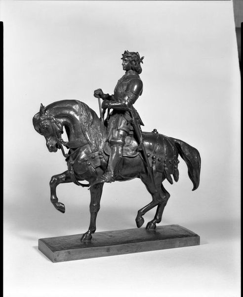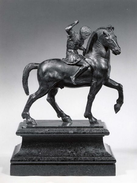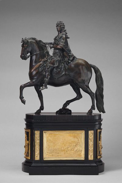 Editor: Here we have "Fame," a bronze sculpture crafted between 1700 and 1715 by Antoine Coysevox. I find the dynamism striking, this winged figure atop a rearing horse… What do you make of it? Curator: This image of Fame, eternally proclaiming from her trumpet, embodies a fascinating desire to secure lasting recognition. What feelings does the rearing horse evoke within you? Editor: Exuberance, definitely. Impatience almost, like it’s bursting to announce something important. It does feel symbolic. Curator: Precisely! The rearing posture speaks of power, aspiration – but consider the potential subtext. Coysevox likely intended this sculpture to capture Louis XIV’s achievements. Does knowing that alter your reading of the figure, the image? Editor: It does, actually. There’s an element of propaganda there, maybe even hubris? Were sculptures like this common? Curator: Royal patronage throughout Europe employed allegory extensively. Visual symbols offered a direct line to cultural memory. Trumpets signified authority, winged steeds divine blessing – connecting rulers to both earthly and celestial realms. Editor: I never considered how carefully those symbols would be curated. It’s more complex than I originally thought. Curator: It's fascinating to see how power utilized and shaped symbols for centuries to influence memory and cultural narratives. Next time you encounter similar imagery, try considering what those symbolic figures meant to their original viewers and how that meaning may have shifted today. Editor: That's a perspective shift I'm definitely going to keep in mind!