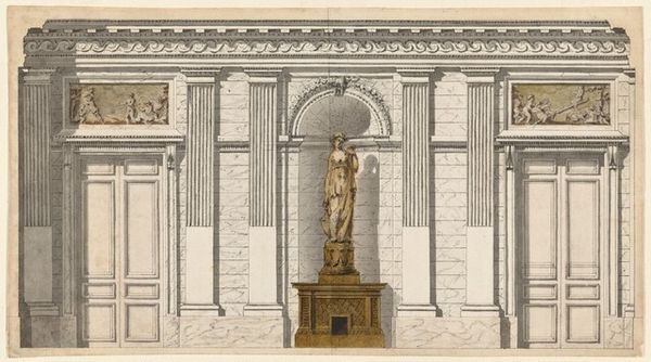Curator: Looking at this etching, what strikes you first? Editor: The almost clinical precision. It's like a perfectly balanced stage set, but somehow… joyless. It feels more about architectural ambition than celebrating a queen, don't you think? Curator: It's interesting you say that. This is Johannes Gottfred Bradt's "Facade in Honor of Queen Caroline Mathilde’s Entrance," likely created between 1741 and 1770. The artwork, currently held at the Statens Museum for Kunst, presents a fascinating historical snapshot of royal spectacle. What kind of social dynamics were at play here? Editor: Totally! Like, what narrative are we being sold? Is this facade genuinely meant to honor her, or is it more a performance of power, an attempt to control public perception through carefully constructed imagery? The Baroque flair definitely gives it an overdramatic feel, doesn't it? Curator: Precisely. Consider Caroline Mathilde's historical context: a young queen in a foreign court, her marriage politically motivated. How did this facade communicate, and perhaps obfuscate, her position? The use of classical realism, while conveying order, arguably suppresses more complex social realities and power imbalances. Editor: Oh, absolutely. You know, the clean lines, the idealized figures…it’s all so…sanitized. It makes me wonder about the untold stories hidden behind the facade, all those messy human emotions that are intentionally erased. I mean, think about the message sent through architectural control; even the citizens were being molded. Curator: Yes, consider its architecture: Corinthian columns arranged within the symmetric façade. Do these allusions to the Roman Empire promote ideals of order? The sculptures in niches could symbolize virtue. How much of this imagery reflects the queen's actual life, and how much served to project an ideal that suits Denmark's political agenda? Editor: Mmh, good point! This wasn't simply a building front; it was about engineering a symbolic narrative. It's the architectural equivalent of a carefully crafted press release, burying the gritty, human aspects beneath a veneer of classical dignity. Curator: I think Bradt’s engraving, intentionally or not, exposes the complex interplay between power, representation, and social control. Editor: Agreed, a building doesn’t just offer shelter; sometimes it tries to imprison stories too.