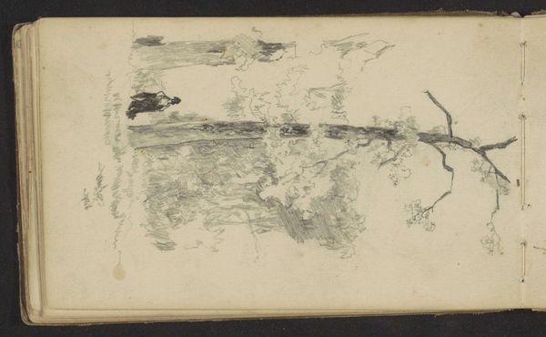 Curator: Willem Roelofs’ “Studies,” dating from 1846 to 1851 and held at the Rijksmuseum, presents us with an intriguing sheet of paper densely filled with pencil and colored pencil sketches. What are your first impressions? Editor: Chaos! A wonderfully energetic chaos. I see multiple landscape sketches overlaid on one another, almost like palimpsests, the earlier drawings struggling to emerge. The visible layers of paper create texture… the rough edges reveal the physical nature of the study. Curator: Indeed. The structural interplay of line and form dominates. Notice how Roelofs uses hatching and cross-hatching to create tonal variation, almost a sculptural depth, within what are ostensibly two-dimensional landscape vignettes. The repetition of forms… lines implying horizon, clustered foliage… serves as a formal exercise. Editor: Exactly. And the materiality! This isn't just a landscape; it's a record of *how* the landscape was perceived and translated through the hand of the artist using simple materials. These repeated landscapes represent a dialogue between Roelofs and his environment through material interaction. Were these preparatory drawings, or was it a form of meditation for the artist? Curator: The ambiguity adds to the fascination. Is Roelofs seeking a perfect composition, or exploring the very essence of “landscape” as an abstract concept? The different pencils suggest perhaps different techniques, different angles toward the subject. Editor: It makes me wonder about his studio, the accessibility of paper and pencil at the time, what constituted ‘waste’ versus ‘worth’ within his artistic practice. The labor involved in creating these sketches. The materiality allows us to reach further to see more within a historical framework. Curator: Your insights ground the piece in a very palpable way, enriching the viewing experience through the lens of production. It becomes less an idealized vista and more a material engagement with the natural world. Editor: And by extension, helps me value more fully the time and the skill invested. The act of art, made materially visible, is rendered anew.