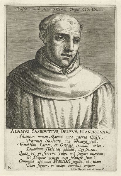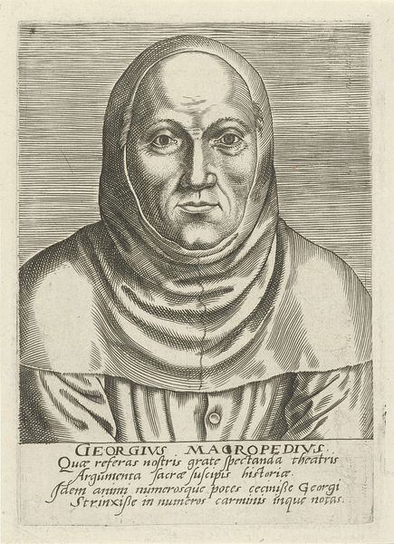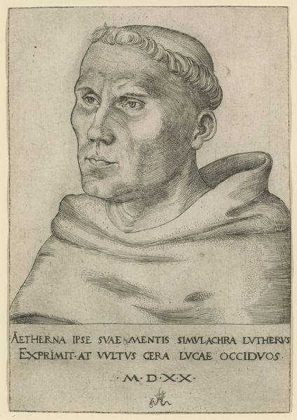 Editor: Here we have Lucas Cranach the Elder’s engraving of Martin Luther as an Augustinian Friar. It's striking how the tight lines create such a compelling likeness. What social forces were at play during this period? Curator: This image isn’t just a portrait; it's a carefully constructed piece of propaganda. Consider the power dynamics: Cranach, aligned with Luther, disseminating his image through print. This was a direct challenge to the established Catholic Church. How might this accessible image have democratized religious authority? Editor: So the visual representation helped to fuel the Reformation? I hadn't considered the political implications of portraiture at the time. Curator: Precisely. And think about Luther's gaze – direct, unwavering. What message does that send to both his followers and his detractors? It’s a powerful statement of defiance and faith. Editor: It's interesting to consider how this image contributed to the shaping of religious and political identities. Curator: Exactly! And how that imagery still resonates today.