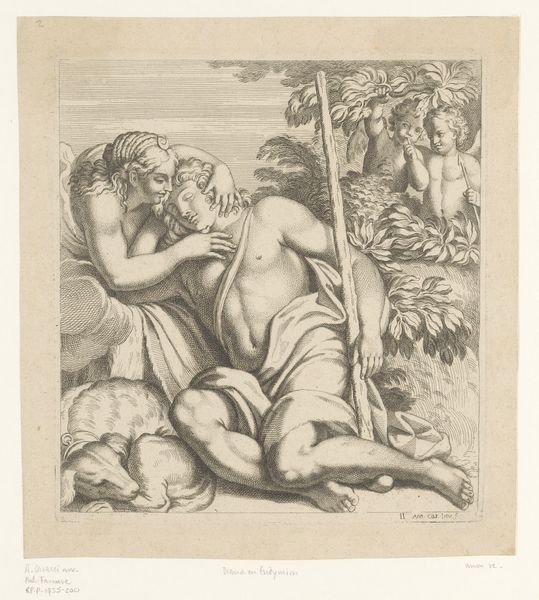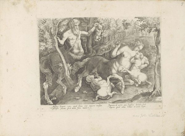 Editor: This is "Afgunst," an engraving by Pieter Jalhea Furnius, made sometime between 1550 and 1625. It’s currently housed at the Rijksmuseum. The stark contrast and meticulous detail create a scene that's both unsettling and strangely compelling. What strikes you about the composition? Curator: The visual construction is intriguing. Observe how the artist uses contrasting textures – the smooth skin of the figure versus the rough landscape, for example – to draw our attention. The landscape itself seems to echo the turmoil of the central figure. Do you notice the figures battling in the mid-ground? Editor: Yes, it almost seems to amplify the central figure's inner conflict. Could you elaborate on that? Curator: Consider the serpentine forms interwoven in the hair and around the beast nearby; these repeated shapes point towards underlying themes. The tension arises not merely from the depicted scene, but also from the very way the image is structured – line, form, and texture all contribute to the feeling of unease. What connections do you see between form and content? Editor: The artist definitely used the texture and the figures to point to chaos and jealousy as themes. It feels like a mirror for the turmoil. Curator: Precisely. It’s a demonstration of how formal elements can become a visual language, allowing the artwork to "speak" beyond the representational. Editor: This analysis makes me view the entire piece in a different way. Now the construction itself enhances the whole story. Curator: Indeed. By looking closely at the artist's choices, we can unearth layers of meaning previously hidden from view.