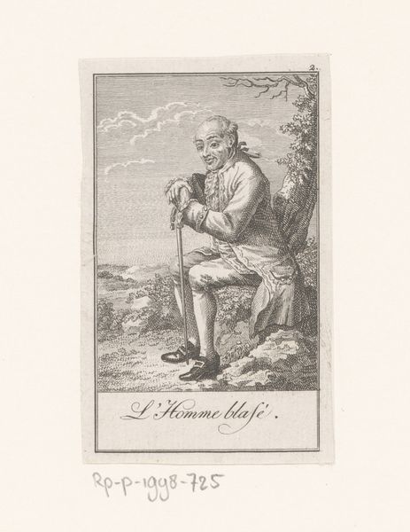 Robert Brichet made this print of a seated man with a walking stick in a landscape using etching. The image encapsulates key aspects of 18th-century Dutch society. The man's relaxed pose and the picturesque landscape suggest a rising middle class with leisure time and an appreciation for nature. His clothing, while not extravagant, indicates a certain level of financial comfort. The presence of a walking stick might imply a leisurely stroll, a common pastime for the bourgeois. The etching technique itself reflects the era's emphasis on detailed observation and scientific inquiry. The Rijksmuseum, as an institution, plays a crucial role in preserving and displaying such artifacts, shaping our understanding of the past. Further research into the social and economic conditions of 18th-century Netherlands would provide deeper insights into the cultural values represented here. The print serves as a window into a specific moment in time, shaped by particular social and institutional forces.