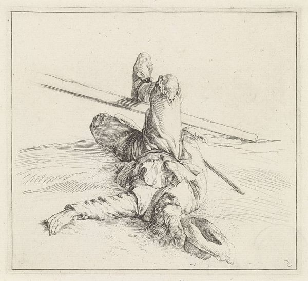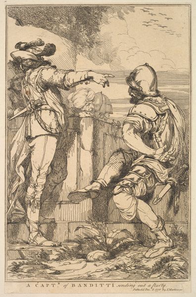 This etching by Salvator Rosa presents us with soldiers, armed and armored, embodying the martial spirit of the 17th century. Notice the prominent spears, symbols of power and readiness, extending upwards, reminiscent of classical depictions of Roman soldiers and their lances. These spears, like the *hasta* of ancient Rome, served not only as weapons but as emblems of authority and military might. The image evokes a sense of timelessness, echoing through history as similar figures, wielding similar weapons, appear across cultures and epochs. The psychological impact of such imagery is profound, tapping into a collective memory of conflict and dominance. This isn’t merely an image of soldiers; it is an articulation of humanity's complex relationship with power. Thus, Rosa's etching is not a static representation but an ongoing dialogue with the past, echoing across time and cultures.
