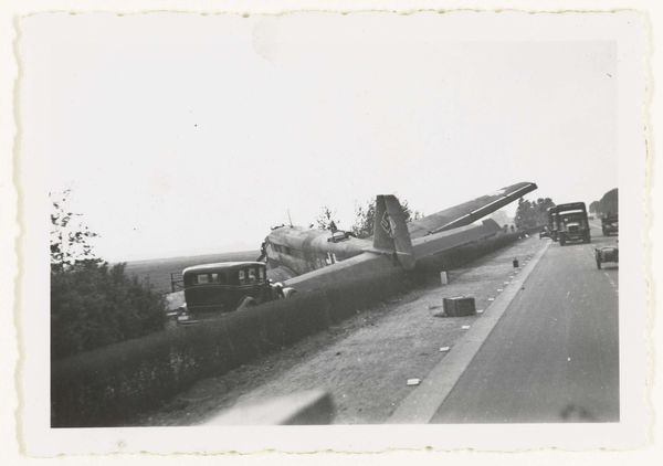 Editor: Here we have an anonymous gelatin-silver print, simply titled "Foto behorend bij album Kriegserinnerungen," placing it within the period of 1940 to 1945. It’s a stark, monochrome image dominated by what appears to be an overturned military vehicle in a barren landscape. There's a real sense of desolation. What story do you think this image is trying to tell? Curator: It's fascinating how seemingly simple images like this can unlock complex narratives. Looking at it from a historical perspective, the photo speaks volumes about the realities of war – beyond the battles, beyond the grand strategies. This wrecked vehicle, isolated in the landscape, serves as a potent symbol of the destruction and the human cost that is always present during socio-political clashes. Who do you imagine was the intended audience for this? Editor: I hadn't really thought about the audience, I suppose, military personnel maybe or even as war documentation for public archives. Curator: Exactly. Consider also how the circulation of images like this – their suppression or their widespread distribution – could influence public opinion, construct a specific wartime narrative. War photography can be a powerful tool for propaganda, for creating heroes or highlighting suffering. What do you think it conveys? Triumph or Trauma? Editor: Definitely trauma. Seeing it now in the museum makes you really question how different groups experienced this war. Thanks. Curator: Absolutely. Museums are ideal public spaces to consider these works and share information and narratives related to traumatic public memories and to understand more fully these moments. Seeing how you initially responded to it shows how effective visual shorthand and history blend.