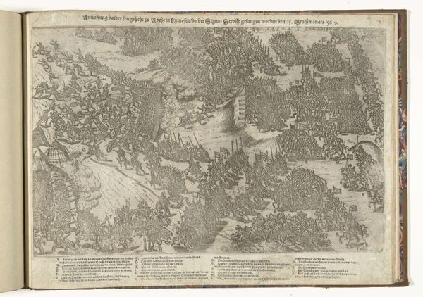 Jean Perrissin’s etching depicts the order of armies in the Battle of Dreux, a key event in the first French War of Religion in 1562. As a bird's eye view, the image presents the two opposing armies, one Catholic, the other Huguenot, meticulously arranged and labelled. The print's detailed rendering of troop formations and weaponry speaks to the period's fascination with military strategy and technology, revealing a culture embroiled in religious conflict. France was deeply divided in the 16th century by religious tensions, and institutions such as the monarchy and the Catholic Church played pivotal roles in shaping the conflict. This print can be seen as a strategic tool, documenting a pivotal moment in the conflict while commenting on the broader social structures of its time. To understand this print better, historians might turn to contemporary military treatises, religious pamphlets, and political documents, offering insights into the contingent relationship between art, society, and institutional power.