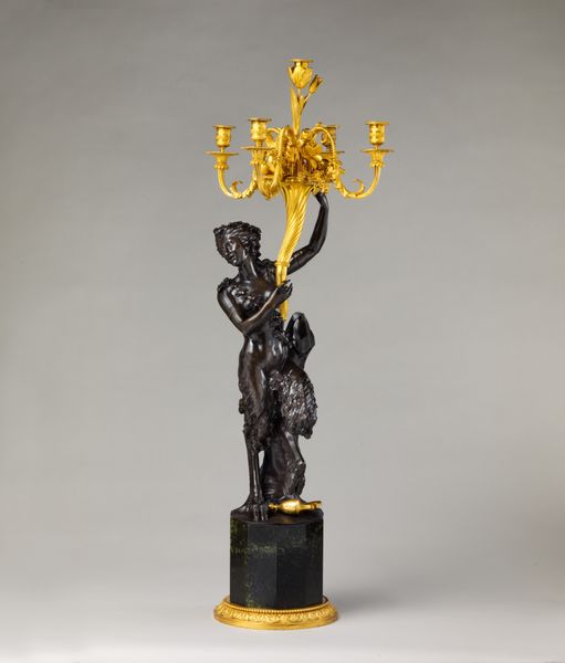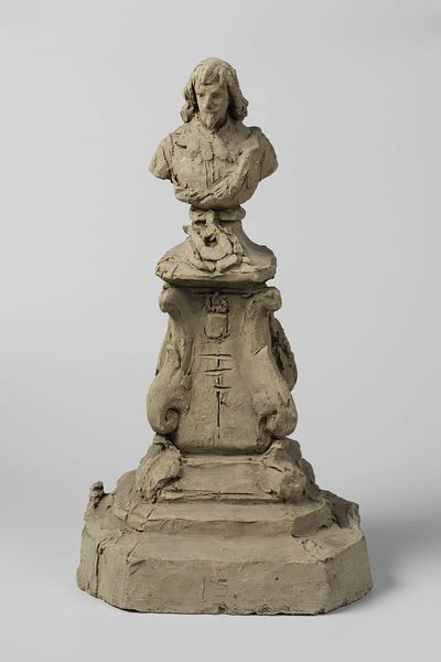 Curator: Standing before us is a bronze statuette by F. Derwent Wood, part of the Tate Collection. Editor: It strikes me as incredibly self-assured, almost haughty, the way the figure looks down from that ornate pedestal. Curator: The artist, palette in hand, is presented almost heroically. Consider the cultural resonance of bronze, a material linked to immortality and artistic legacy. Editor: And the labor invested! The casting process, the tooling, the detailed chasing... It’s a testament to craftsmanship, a physical record of artistic effort. Curator: It seems to be a celebration of artistic creation itself, imbuing the artist with an almost godlike status. Editor: Yes, and it all depends on the sculptor having access to materials, labor, and the patronage to make it all possible. Curator: Indeed, and by understanding both the symbolic language and the material conditions of its creation, we gain a richer appreciation. Editor: Absolutely; it reveals the complex realities behind even the most seemingly straightforward artistic representations.