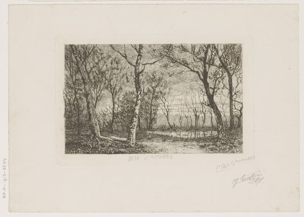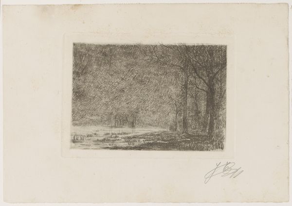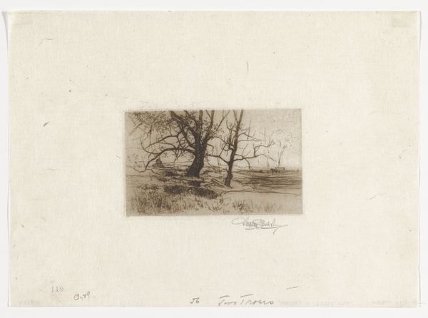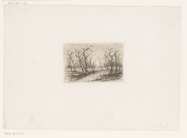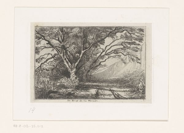 Carel Nicolaas Storm van 's-Gravesande created this landscape with nut trees using etching. The network of fine lines creates an atmosphere that feels both intricate and airy. The composition is anchored by the solid presence of the trees, whose dark branches reach across the scene. The artist uses the etching technique not just to depict but to explore the very structure of the landscape. Notice how each line, each stroke, contributes to a larger pattern. The trees are not just objects but a series of complex networks, a semiotic system in which each branch signifies growth and form. The light filters through these structures, creating a play of shadow and light that challenges a static view of nature. The landscape invites us to consider how we perceive and construct our understanding of the natural world. The trees act as a scaffolding through which we view the scene, turning a simple landscape into a complex, layered experience.