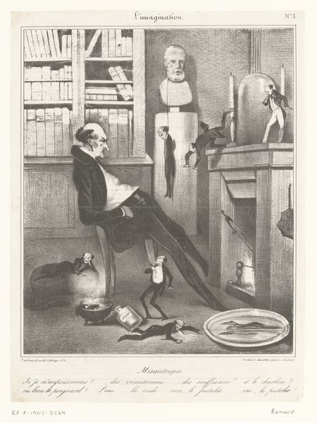 This is Honoré Daumier’s lithograph, "Caricature of a Misanthrope Contemplating Suicide," printed on paper. The composition is dominated by diagonal lines. The slumped figure of the misanthrope sits precariously, mirroring the instability of his mental state. Daumier uses stark contrasts in light and shadow to intensify the emotional impact. The dark suit of the man, set against the lighter background, makes him stand out. The whiteness of the classical bust is in sharp contrast with the gloom. The series of miniature suicide attempts – hanging, poisoning, stabbing – are displayed almost comically around him, like props in a macabre theatre. These elements serve to destabilize the traditional romanticisation of suicide, presenting it instead as a farcical contemplation, challenging our expectations of tragedy. The image, far from being a straightforward depiction of despair, functions as a critique of the melodramatic excesses.