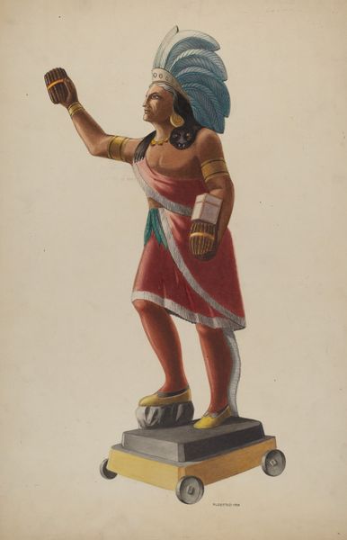 Chris Makrenos created this artwork, "Cigar Store Indian," using watercolor and graphite on paper. The painting presents a full-length depiction of an Indian figure, rendered with careful attention to texture and detail. The figure's pose, shielding his eyes as if scanning the horizon, immediately draws us into a narrative of watchfulness. The use of color – earth tones for the skin and garments, contrasted with the vivid feathers – not only adds visual interest but also emphasizes the figure's connection to the land and tradition. Note how the artist uses line and form to create a sense of depth, particularly in the draping of the shawl and the contours of the face. This work invites us to consider representation. The semiotic weight of the figure is a commercial object and a symbol laden with cultural meaning. It destabilizes fixed notions of identity and authenticity. It prompts us to reflect on how signs and symbols are produced, circulated, and consumed within a given cultural context.