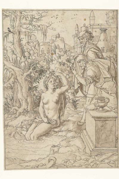 Curator: What a dreamy tableau. Looking at this work, attributed to Raffaele da Montelupo and created sometime between 1520 and 1540, I feel myself wanting to join the sleeper in her repose. Editor: Yes, there’s an immediate sensuality, isn’t there? But I'm also struck by how actively the drawing contests idealized notions of Renaissance beauty and feminine passivity, perhaps because the main figure is not a goddess but simply a naked woman resting among playing children, maybe even the artist's preparatory study from life. Curator: Exactly! It is sketched with pencil and ink; the details aren't perfect; some children don’t seem proportionate at all. I suppose this raw quality, an unfinished touch, only intensifies the feeling that we’re looking at something very intimate, perhaps an encounter with real people that happened almost spontaneously. Editor: True. Also, the abundance of children feels less allegorical and more earthly. Considering it in the context of the Italian Renaissance and its humanistic leanings, perhaps Montelupo subverts the mythologized nude by positioning the mother not as some symbolic Venus but instead within her complex role as a maternal figure. Curator: That’s lovely – it flips the power dynamic of that ubiquitous trope. Though, I admit, those scores of mischievous babies cavorting with what appear to be musical instruments make it difficult for me to completely cast aside allegory. Their numbers evoke something, even if I can't quite name it. Editor: I would posit that those seemingly harmless figures become a powerful symbolic counterpoint when viewed alongside issues of gender roles and expectations of motherhood within the era, but the truth is that so little is known for sure about Montelupo and this particular piece. It invites many readings, even competing interpretations. Curator: Perhaps. I wonder if Raffaele would be happy that we are still dreaming up ways to see his “Slapende naakte vrouw en spelende kinderen" centuries later. Editor: That is the remarkable gift that art provides: a continuing exchange. Thank you, Raffaele da Montelupo, and thank you to this artwork for inviting us to reflect today on a wide spectrum of experiences and considerations related to motherhood, identity, art, and culture.