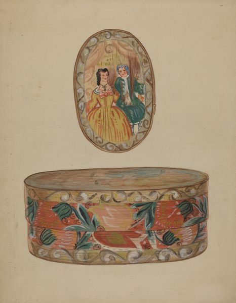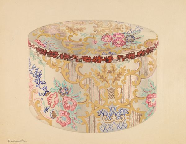 This is Gilbert Sackerman's Bandbox, made with watercolor. The yellow peeks out from under the decorative pattern, giving it a kind of glowing energy. It’s like he found a way to trap the sun inside this box. Sackerman’s got a real process going on here, not too precious or overworked. The colors are layered, a bit transparent. You can see the brushstrokes, especially in the leaves and petals. Each mark feels immediate and intuitive. Look at the brown leaves that frame the flowers – the way he flicks the brush, creating a sense of depth and movement. The texture isn’t smooth or blended; it’s raw and honest. It makes me think about how much we try to hide the work in art, but here it’s right out in the open. It reminds me of some of Henri Rousseau’s paintings, that same playful simplicity and love for botanical forms. Sackerman’s Bandbox embraces ambiguity, reminding us that art is always a conversation, an open question.
