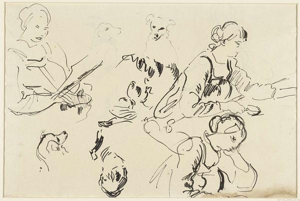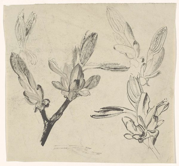 J.A. Jerichau made "Blomsterskitser" with ink on paper. It's not about polished perfection, but more about feeling the flower through the hand. Look at the varied line weights - some lines are bold and assertive, others whisper across the page. It’s like Jerichau is thinking out loud with the pen, letting the ink lead the way. The sketches feel intimate and immediate, like a page torn from a personal notebook. Take the cluster of buds near the bottom left; the dark pooling of ink there gives weight and volume to the form, but also suggests a kind of urgency, as if the artist was trying to capture the fleeting moment before the bud unfurls. It reminds me of Cy Twombly’s gestural scribbles, that same sense of capturing something ephemeral. Ultimately, art is about this ongoing conversation, a messy, beautiful, and always unfinished dialogue.