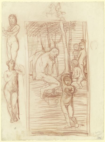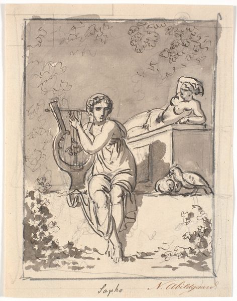 Curator: Albert Lang's pencil drawing, "Apollo and two muses," presents us with an intriguing study in neoclassical ideals. Editor: It has an unfinished, almost sketch-like quality that's quite appealing, even if the mythological subject matter feels very traditional. What do you see in this piece, especially considering its creation through such basic materials? Curator: The simplicity of the pencil actually reveals a lot about artistic labor and the social context of art production at the time. Notice how the artist meticulously renders the figures' anatomy, mimicking classical sculptures? It speaks to the artist's training and the academic system. Editor: So, the medium itself becomes part of the message? The drawing emphasizes the artist’s skill and process? Curator: Precisely. The choice of pencil, a readily available material, also democratizes artmaking in a way that grand oil paintings of the era don't. Consider also who was able to receive the artistic training necessary to produce this work, which can suggest how socioeconomic systems played into both art's subject matter and means of production. Who, historically, had access to pencils, drawing paper, and art schools? Editor: That’s interesting. So the art-making itself reinforces social structures, rather than purely expressing beauty? Curator: It's more than that; even seeking “beauty” involved resources and materials unavailable to most people. The seemingly humble pencil drawing becomes a tool to explore those very issues of production and consumption. Editor: I never thought about it that way, the pencil revealing the means and social circumstances needed for the work in the first place! Thanks for helping me understand the process of art-making better! Curator: It is fascinating, isn’t it? It shows that material choices always shape the artistic narrative in complex ways!