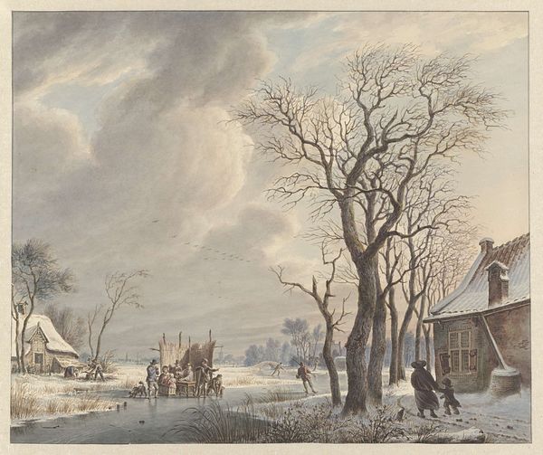 Editor: This is Jacob Cats' "Farmyard in Winter," made around 1786 using watercolor and drawing techniques. There’s something very serene about it, despite the barren trees and cold landscape. What captures your attention in this scene? Curator: The winter scene, rendered with such delicate strokes, is not just a landscape; it's a repository of cultural memory. The thatched roofs, the bare trees, even the activity of the figures all speak to a specific understanding of nature and rural life in the late 18th century. Consider the pig foraging in the snow. How might that simple image resonate with contemporary viewers familiar with agrarian life? Editor: I hadn't considered it that way. It just seemed like part of the scenery. Curator: It's more than just scenery. Pigs have long been symbols of sustenance, but also of impurity. In this context, its presence can symbolize hardship, where even survival is a matter of foraging. What feelings does that evoke, thinking about how animals function as signs of the times? Editor: A bit somber, I suppose. It’s interesting to think about everyday elements carrying such symbolic weight. The composition is also quite striking – how the boat-like structure divides the view, do you think it is intended for symbolic meaning? Curator: Absolutely. Watercraft and shipbuilding serve as metaphors for journeys, life's voyage, and the reliance on trade. Perhaps also a symbol of hope, of surviving through the harsh winter and building towards a more promising season? Cats captures how these images embed continuity in rural existence. It suggests the cultural endurance, even during times of Neoclassical upheaval. What has stood out most for you so far? Editor: Definitely seeing the layers of meaning within seemingly simple images, and how the mundane connects to larger cultural ideas. Curator: Precisely. It's about seeing the everyday as extraordinary. The weight it carries enriches our understanding of the era.