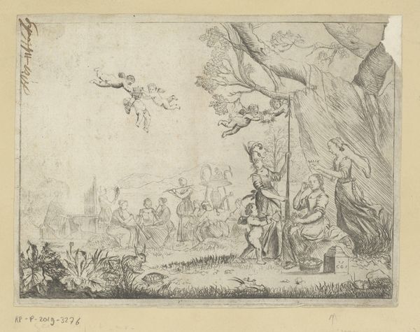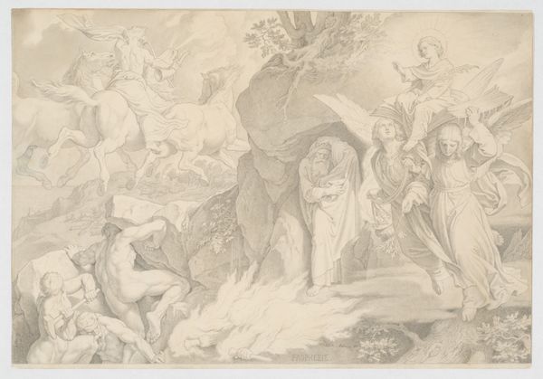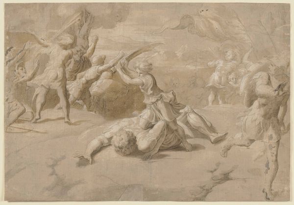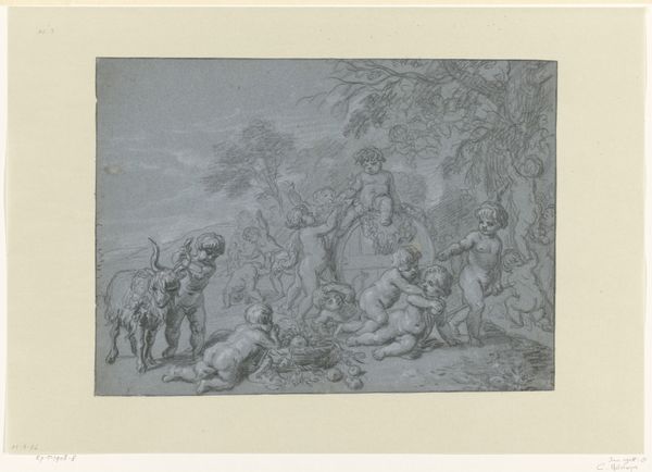 Curator: Here we have a drawing by Jean Baptiste Marie Pierre, titled "Ein mit einem Lorbeerkranz bekrönter Herrscher lässt vor der Statue des Amor Opfer darbringen." It is crafted with ink, gouache, and drawing techniques from the 18th century. Editor: My god, that title is a mouthful. It feels... ethereal, like a faded memory trying to recall a grand, romantic scene. But everything is dissolving, smoky and ambiguous. Curator: Indeed. The composition exhibits a clear Rococo sensibility. Notice the emphasis on curvilinear forms, the light tonality, and the almost theatrical arrangement of figures across the picture plane. The thematic content also engages with allegory and historical painting. Editor: The cherubs floating above seem more mischievous than divine, right? Perched on clouds that look like spun sugar, they almost mock the serious ceremony unfolding below. Is this supposed to be celebratory or a bit cynical? Curator: I interpret it as an idealized representation of power, legitimized through classical allusion and the embrace of Amor. Consider the semiotic weight of the laurel wreath – a symbol of victory and authority. Note, also, the architecture anchoring the stage-like scene. Editor: But even the powerful, laurel-crowned dude is making offerings to a little love statue. How fragile and fleeting all of this pomp seems when placed next to, like, the basic human need to be loved and desired. The muted tones are appropriate; love changes, and empires crumble. Curator: From a purely formal perspective, the work functions as a study in light and shadow, leveraging the tonality of ink and gouache to suggest volume and spatial recession, while imbuing the overall scene with elegance. Editor: It’s funny, the older I get the more I realize everything comes down to love. And how insane people get pursuing it, clinging to it, demanding it! I suppose Pierre captured a very basic truth about the follies of the human heart. Curator: An insightful observation, offering an affective reading beyond the purely stylistic considerations. It reminds us of the importance of considering both form and content in art historical analysis.