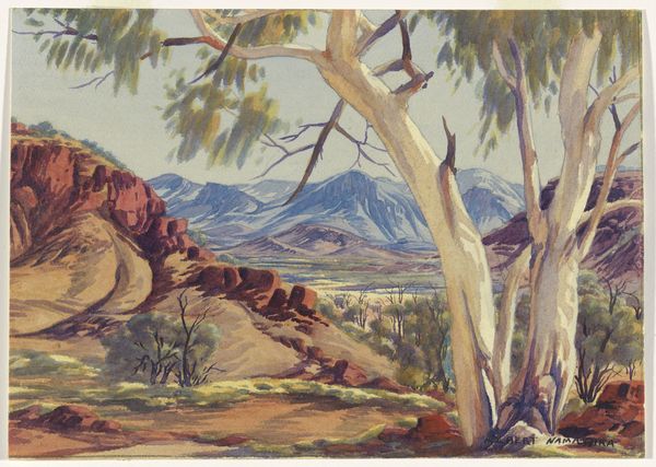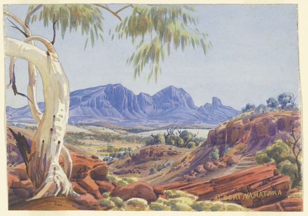 Curator: Gazing upon "Alice Springs Country" from 1954 by Albert Namatjira, I’m immediately drawn into its embrace. It feels like a snapshot of home. Editor: Immediately, the watercolor painting gives a quiet impression—a study in the contrast between the close, sun-drenched ochres of the foreground and the muted blues that define the distant mountain range. The tree trunks divide the pictorial plane vertically, a structural anchor against the sprawling landscape. Curator: That tree... she’s almost like a sentinel. Watchful, you know? And the land unfurls from those rugged rocks. It makes me think of dreaming when you are walking country. It is deep seeing. The colors speak of something sacred to me. It isn’t just what my eyes see but it speaks directly to my heart. It gives such belonging and connectedness to nature. Editor: Precisely, and this connected use of color draws your attention from a point in the near ground, where Namatjira deploys striking realism, slowly, as your eyes follow upwards, morphing that same detail, dissolving the world before us in atmospheric hazes that abstract the real landscape into feelings of deep, serene, quiet meditation, an escape. The composition subtly reinforces the notion of receding space through strategic color use, as an Indigenous way. Curator: And did he embrace the Western style, no doubt, to paint his home in a way they, too, could understand? There’s always this balancing act, painting between worlds. That weight gives this work all the more feeling for me. Editor: Yes, the work is fundamentally structured around dualities, that dichotomy in cultures you talk of: light versus shadow, warm tones against cool, precision near dissolving to suggestive softness as distances increase. Namatjira gives a lesson in how structural elements may also have symbolism of their own, a visual tool and not merely just pictorial ones, as can be often overlooked by academics. Curator: So much is overlooked, truly! When you learn that this wasn't just art but defiance, resilience shining through. It echoes how much he held to tradition even while using new forms. His paintings, full of stories just like country itself. It fills my senses still. Editor: I couldn't agree more. As you suggested, this careful composition demonstrates how Namatjira was speaking on two different plains to different people, which has to elevate him not just as an Indigenous artist, or landscape painter, but also to an extremely intelligent man in touch with the many dimensions between worlds and peoples.