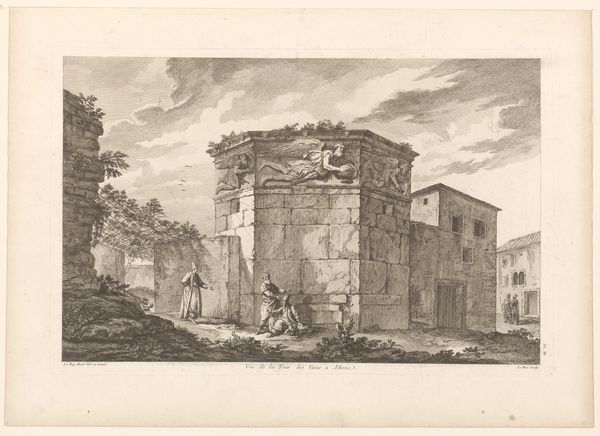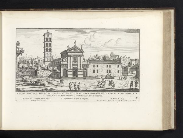 Curator: This print from 1575 by Étienne Dupérac offers a detailed look at the Forum of Trajan, complete with Trajan’s Column, in Rome. The piece, rendered in ink on paper using engraving techniques, gives us a view of the cityscape during that period. Editor: My immediate reaction is one of almost severe linearity. The rigid architecture and carefully etched lines create a formal, even austere atmosphere, don't you think? The visual organization is compelling; it really captures a strong sense of space and depth, doesn't it? Curator: Indeed, and it’s crucial to situate this severity within its historical context. This wasn’t just an architectural rendering; it was also a political statement about power and legacy. Dupérac was very deliberate with his presentation of Roman power in light of the socio-political tensions within Italy during this period. He uses the column as a firm and ever-present statement, almost as a critique on then-present instabilities. Editor: Absolutely, and we can't ignore the structural language itself. Look at the dominance of vertical lines leading up to that central column—they draw your eye upwards in this incredible motion and focus your attention onto it. It serves as the structural linchpin, establishing a sense of order and classical harmony amidst the architectural complexities, while establishing a sense of height, like power extending to the heavens. Curator: And the inclusion of everyday figures amidst these architectural giants makes this even more impactful. Think about the ways Dupérac contrasts human scale with imperial ambition, causing reflection on the relationships between public and private life. In light of this power balance, you may consider whether one of these ideas truly supports the other. Editor: I find that contrast compelling on a purely visual level, too! Note the intricate textures achieved with ink, juxtaposed with the relative emptiness of the sky. That formal balance is what really speaks to me. I can admire the content while admiring the style. Curator: It shows us the enduring dialogue between artistic form and the realities it represents and reflects, as relevant now as ever. Editor: Precisely. Examining this print has highlighted for me the remarkable ability of simple lines to convey layers of formal and contextual meaning, while sparking thought for the audience.