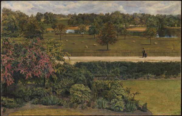 Curator: This is Paul Maitland's "Kensington Gardens: Vicinity of the Pond," housed here at the Tate. Maitland, who lived from 1863 to 1909, gives us a glimpse into everyday life during that period. Editor: Oh, it feels like a fleeting moment, almost like a half-remembered dream. The hazy light softens everything, making the figures mere suggestions. Curator: Exactly. Maitland’s technique involves thin layers of paint, almost a wash, focusing on capturing the atmosphere and social scene. His works often depict the commodification of leisure. Editor: The fence dividing the foreground from the activity behind really emphasizes that separation of space and class, doesn’t it? I almost feel like an outsider looking in. Curator: Precisely, the composition highlights access and the ways public spaces were, and still are, subtly regulated and experienced differently. Editor: It makes me wonder about the lives of those tiny figures, what they were thinking, feeling... but the painting offers no easy answers. Just a gentle, melancholy invitation to observe. Curator: Indeed, it’s a meditation on modern life, and its structures, rendered with a delicate hand. Editor: A lovely, quiet piece. I am happy I could consider this a bit longer.