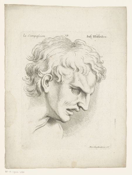 This is an anonymous print titled 'Head of a Young Man in a State of Attention' held here at the Rijksmuseum. The absence of the artist's name complicates our reading but also opens up avenues for exploring broader historical trends. During the period this print was likely made, there was a profound interest in physiognomy—the idea that one could discern character through facial features. The print, with its detailed rendering of the young man's features, invites us to participate in this speculative practice. The intense gaze and furrowed brow suggest deep thought or perhaps concern, but is it an honest portrayal of emotion? Or a performance of masculinity? Consider that such images often served didactic purposes, offering models of idealised masculine traits. What does it mean to teach attention? To whom is this lesson directed? The work captures a moment of introspection, yet also serves as a mirror reflecting societal values and expectations.