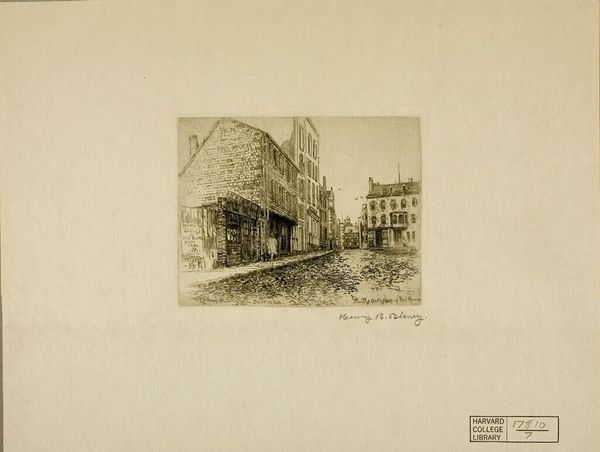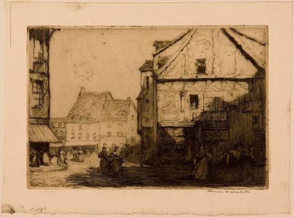 Curator: Henry Robertson's etching, "Old North Church in Olden Time," presents us with a fascinating look at the material conditions of early urban life. The dimensions of the plate itself are quite small, just over 11 by 19 centimeters. Editor: It's an image that evokes a certain nostalgia, doesn't it? Almost romantic in its depiction of the past. Curator: Notice the dense, cross-hatched lines; this speaks to the labor-intensive etching process. These details suggest an aesthetic valuing the handmade, perhaps in opposition to the increasing industrialization of his time. Editor: But who is this "old" north church for? Is this a look back at a simpler time when the church dictated the moral and social landscape, or does this serve as a critique of that time? Curator: It's interesting to consider how this print, with its specific materials and techniques, participates in a larger dialogue about progress, history, and the changing role of craft in a modernizing world. Editor: Exactly, and Robertson's choice to depict this specific church in such a style could be interpreted as a way of highlighting the enduring influence, or perhaps the fading relevance, of traditional institutions. Curator: A potent reminder that art objects are not made in a vacuum. Editor: Absolutely. And it invites us to question the narratives of the past we choose to preserve and how we choose to remember them.