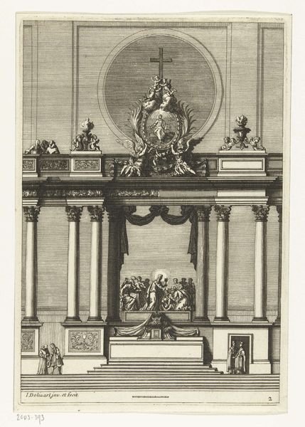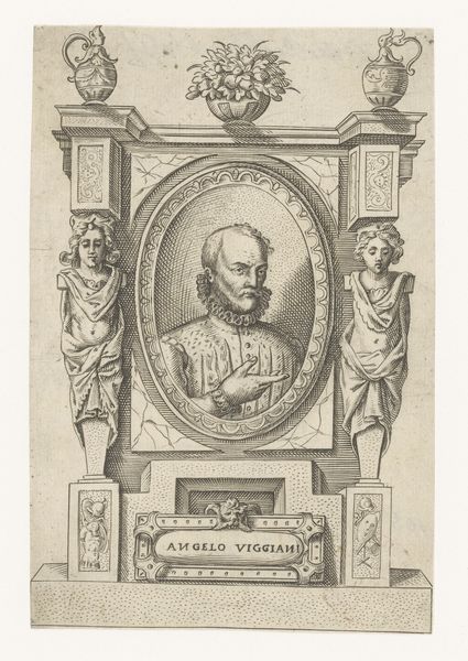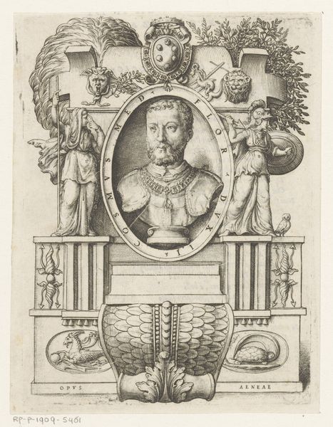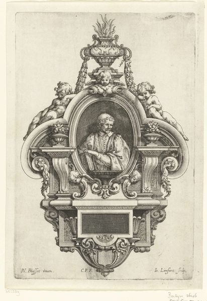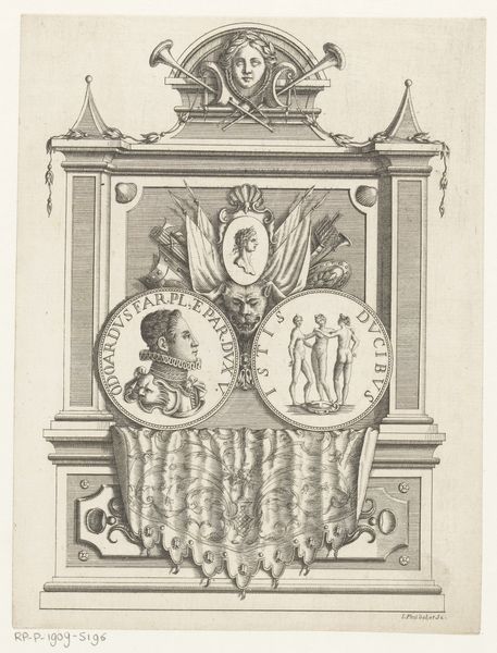 This ornamental architectural object with the portrait of Ranuccio Farnese I, Duke of Parma and Piacenza, was produced by Giuseppe Pini, using etching techniques. The material qualities of the print influence its appearance, with the precise and delicate lines creating a sense of depth and texture. The etching process involves coating a metal plate with wax, drawing the design, and then immersing it in acid, which bites into the exposed lines. The plate is then inked and printed, transferring the image onto paper. The techniques employed demanded considerable skill, reflecting the traditions of printmaking that were intertwined with artistic expression. The social significance of this print lies in its celebration of power and status. As a form of visual communication, prints like these played a role in shaping perceptions of political figures. The materials and processes used in its creation are intrinsically tied to wider social issues of labor, politics, and consumption. Understanding the materials, making, and context is essential to grasp the full meaning of an artwork, challenging traditional distinctions between fine art and craft.