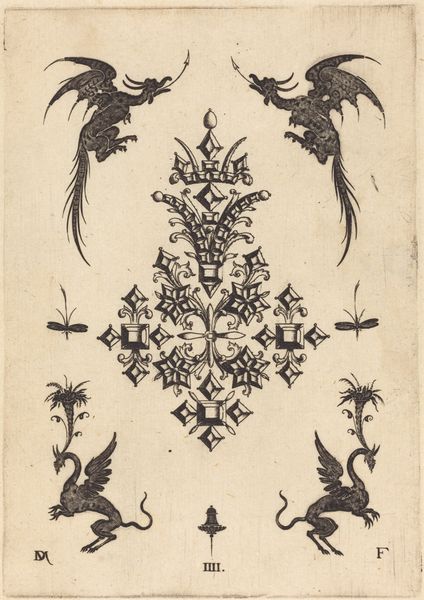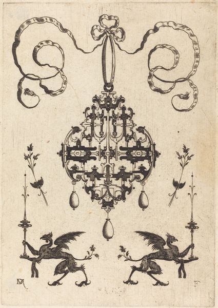 Curator: Look at the incredible detail in this engraving! This is “Brooch with Fantasy Animals at Top and Fauns with Vases at Bottom,” created around 1596 by Daniel Mignot. The precision of line is just extraordinary. Editor: It’s certainly striking, if a bit bizarre. Those serpentine dragons at the top seem a bit at odds with the geometric ornament in the center. Almost unsettling, the way the figures frame the symmetrical designs. Curator: Mignot was clearly interested in pushing boundaries, incorporating the fantastical alongside more traditional decorative elements. The contrast highlights the artistry of both forms. Remember this wasn't merely art for art's sake; it was pattern-making that influenced goldsmiths' work. These prints offered tangible designs. Editor: I’m fascinated by the labor involved in crafting such intricate detail through engraving. Imagine the repetitive movements, the intense focus required. The print almost becomes a document of meticulous human effort, a tangible record of the maker’s engagement with material. How were prints like this circulated? Who purchased them and how might they have informed or influenced labor practices more broadly? Curator: The accessibility of prints meant wider dissemination of artistic ideas and, as you say, models for skilled artisans. It allowed a democratization of design previously confined to wealthier circles who would commision goldsmiths. And while the print does feel quite two-dimensional, I can easily imagine that center motif realized as an ornate piece of jewelry, maybe something embellished with gemstones and fine metals. Editor: Indeed. The materiality it depicts evokes that transformation from the page to something precious and worn. We should also think about who wore these brooches—what level of society was permitted or had access to it? Curator: Exactly. Examining it like this makes you think not only about the beauty of it, but about the economics behind that production of beauty, doesn't it? Editor: Yes, considering this intricate design work we see today opens a door to a wider exploration of craft production in the late 16th century. The level of complexity raises compelling questions regarding value and social status.