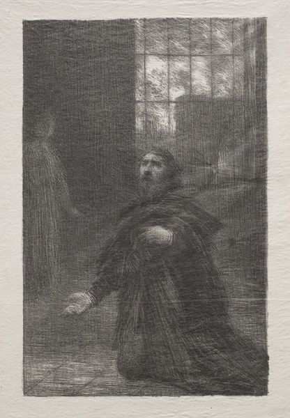 Editor: We're looking at "Rienzi, Act V: Rienzi's Prayer," a lithograph by Henri Fantin-Latour from around 1886. The scene feels intensely private, a moment of supplication, rendered with such stark contrasts. What draws your eye in this piece? How do you interpret this work within its historical moment? Curator: The piece immediately reads as a meditation on power, faith, and ultimate failure, a potent cocktail served during a period rife with anxieties about national identity and political upheaval in France. Fantin-Latour, rooted in Romanticism, chose to illustrate a scene from Wagner's opera "Rienzi," about a populist leader whose ambitions lead to his downfall. Notice how the composition stages Rienzi’s internal struggle: the darkness enveloping him contrasting with the distant, inaccessible light. Editor: The contrast between darkness and light really highlights the emotional weight. I'm wondering, how does Fantin-Latour use the historical narrative to comment on the politics of his own time? Curator: That's key. Remember, late 19th-century France grappled with the legacy of revolution and empire, seeking to redefine itself. Rienzi becomes a figure through which Fantin-Latour explores the seductive yet dangerous allure of charismatic leaders and the fragility of popular movements. His prayer, offered amidst ruin, speaks to a deeper crisis of faith – both religious and secular – at a time when traditional structures of authority were crumbling. Editor: So, you're saying it is more than just a scene from an opera; it's a reflection on leadership, failure, and faith in a changing world. I’m now considering how the ambiguity in the light affects the overall message about political hope and despair. Curator: Exactly. Fantin-Latour prompts us to question the narratives we build around leaders and the consequences of unchecked ambition, an artistic intervention relevant across centuries. It encourages critical engagement with the stories we tell ourselves about power. Editor: I see how this print encapsulates much more than just a scene; it’s a mirror reflecting anxieties about power and faith in late 19th-century France, really relevant even now. Thanks for shedding light on the work's multilayered message.